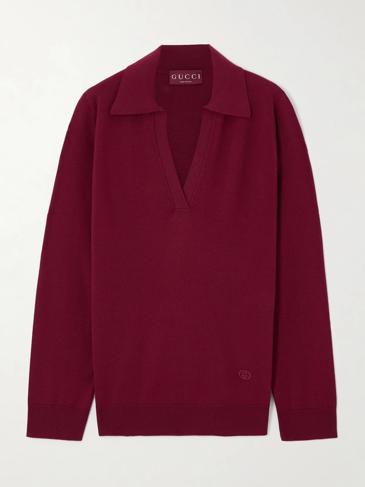 The dark-red shade of Gucci's polo shirt is perfect for fall. Made in Italy from wool, it has a relaxed shape tempered by ribbed trims and is embroidered with a tonal 'GG' emblem above the hem. The deep V-neckline is perfect for framing a pendant.