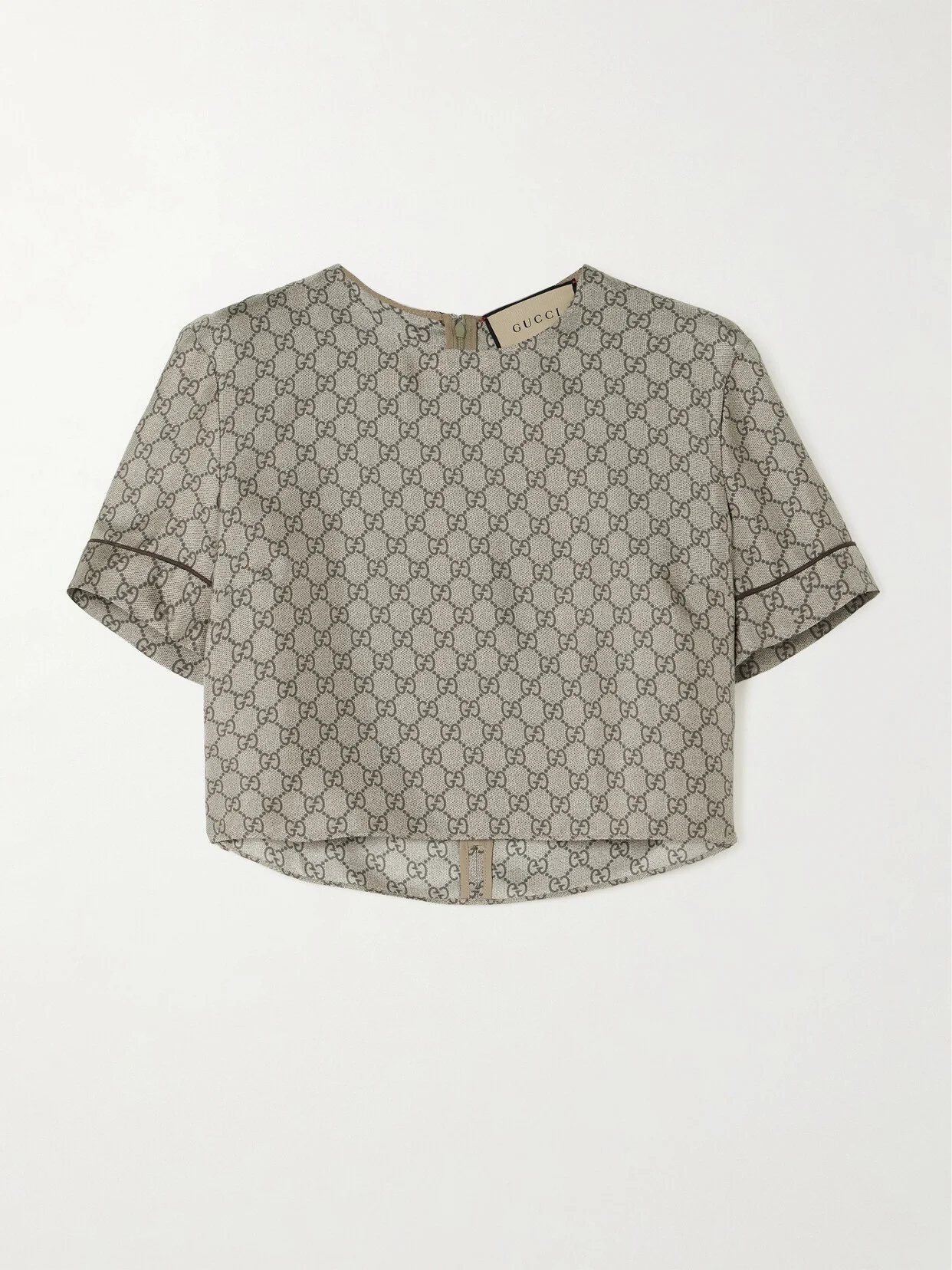 Gucci's 'Supreme' top is sharply cut from silk-twill, allowing the statement 'GG' logo print to do the talking. Made in Italy, it has a boxy fit with a darted bust and tonal-brown piping. Complement the cropped fit with high-rise shorts.