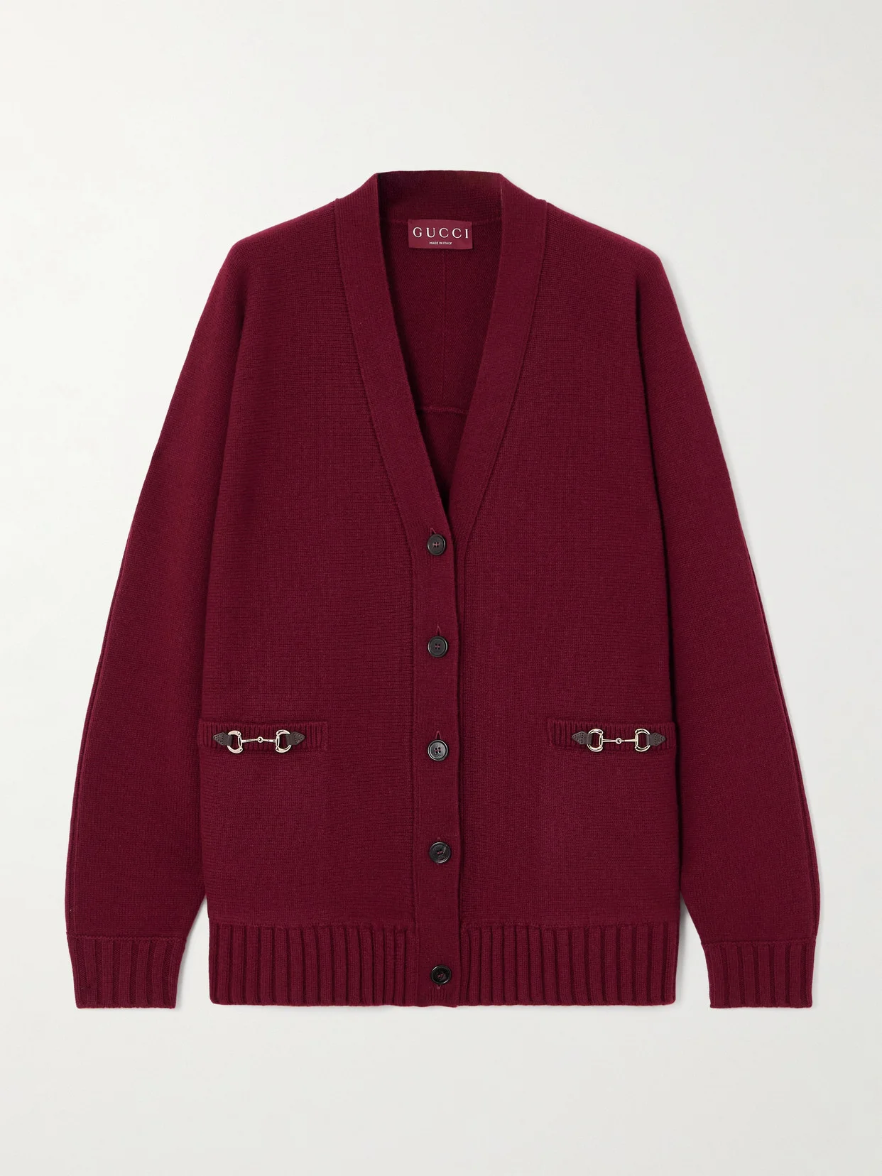 Gucci's cardigan draws the eye with polished horsebits. It's knitted from wool and cashmere-blend and has leather tabs holding the hardware in place.