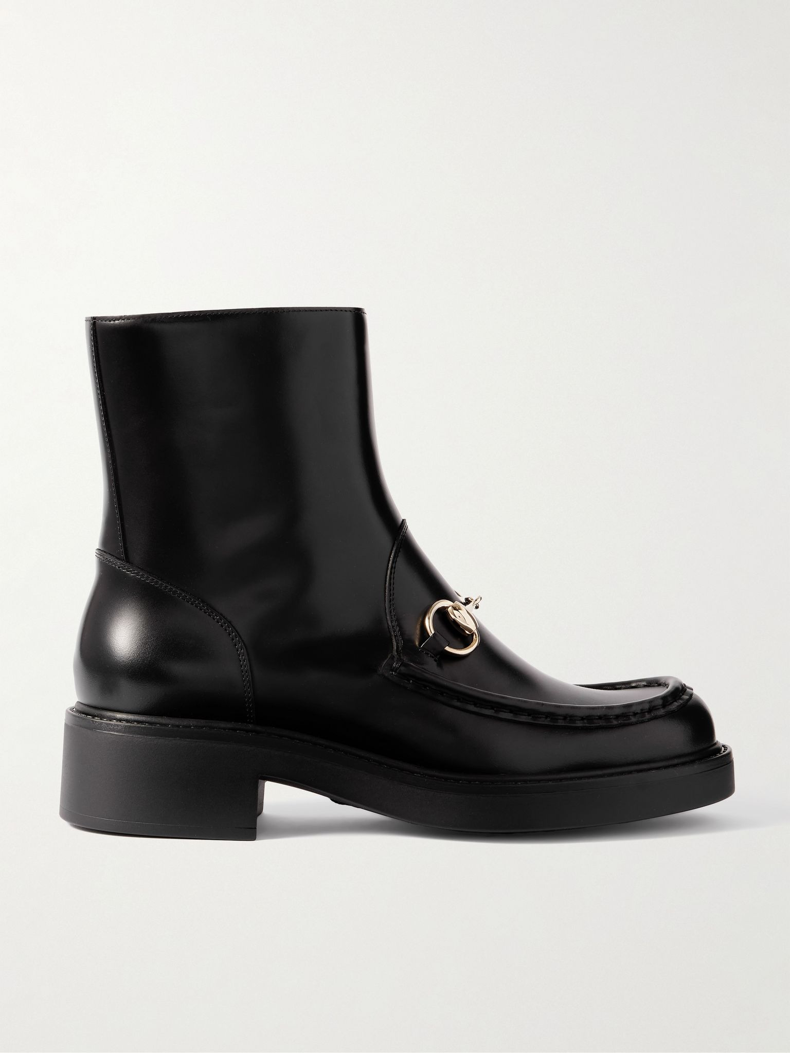 Gucci's signature horsebit was created in 1953 by the founder's sons as a tribute to their late father's love of all-things equestrian. Featuring a gold-tone version of the motif, these ankle boots are made from panels of patent-leather and set on chunky soles. Details & Care - Heel measures approximately 40mm/ 1.5 inches - Black patent-leather (Calf) - Zip fastening along side