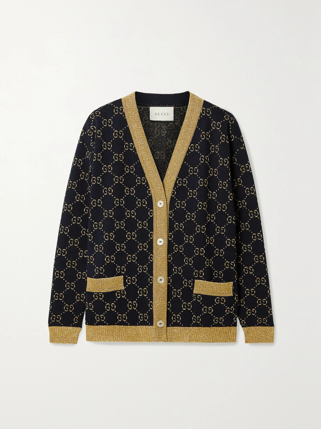 Gucci's cardigan showcases the interlocking GG monogram - arguably the house's most recognizable code. It's been jacquard-knitted in Italy from soft cotton-blend and has a relaxed fit that's defined by gold trims. Fasten every mother-of-pearl button to create a plunging neckline or leave them undone when layering it over the matching top.