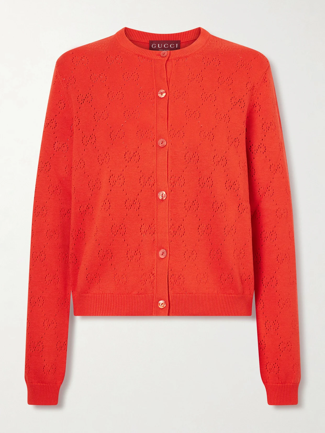 For the Cruise '26 collection, Gucci reimagines its heritage codes in new textures and shades. Knitted from silk-blend with a generous helping of cotton, this chic cardigan is pierced all over with the iconic 'GG' monogram motif. Wear it buttoned up with tailored pants or layered over a simple tank.