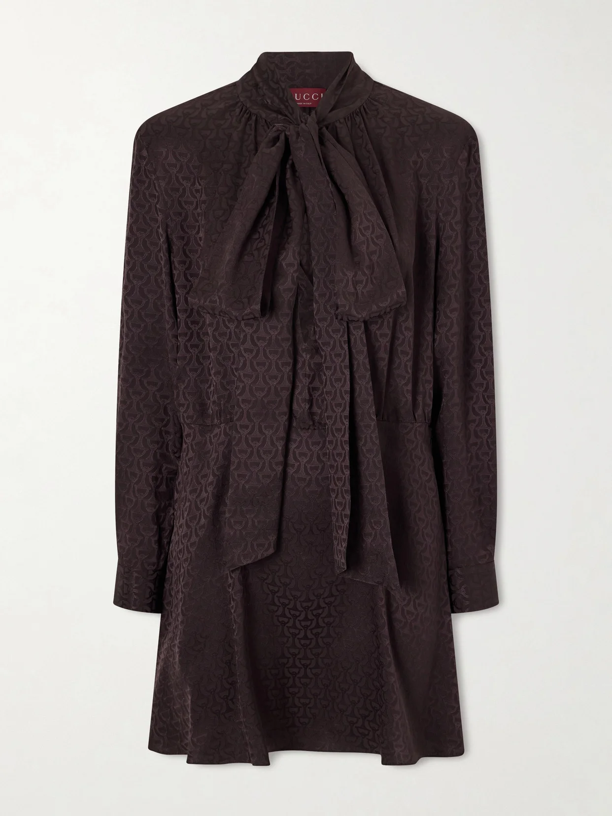 Gucci's dress has pussy-bow ties at the neckline that are chic and exaggerated. It's cut from silk-jacquard which showcases a version of the label's iconic horsebit motif, influenced by the brand's early equestrian roots.