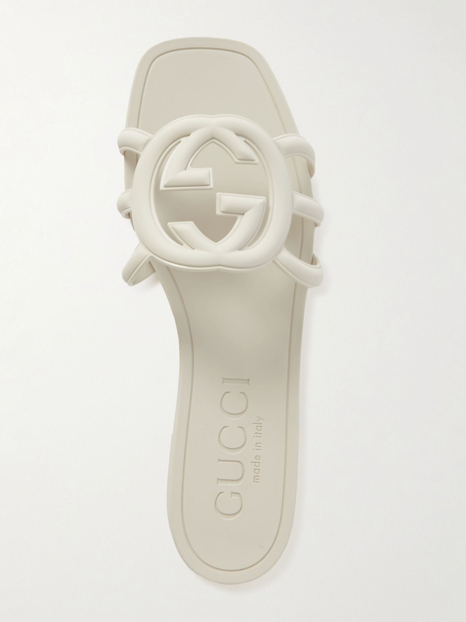 Perfect for the pool or beach, Gucci's slides are constructed from durable rubber in a fresh white shade. The strap is comprised of a cutout version of the iconic 'Interlocking G' logo, so it frames your foot prettily. Size & Fit - Fits true to size, take your normal size - Only available in full sizes, go down to the nearest whole size if you take a half size - Italian sizing Details & Care - Sole measures approximately 10mm/ 0.5 inches - White rubber - Slip on - Designer color: Oscar Water