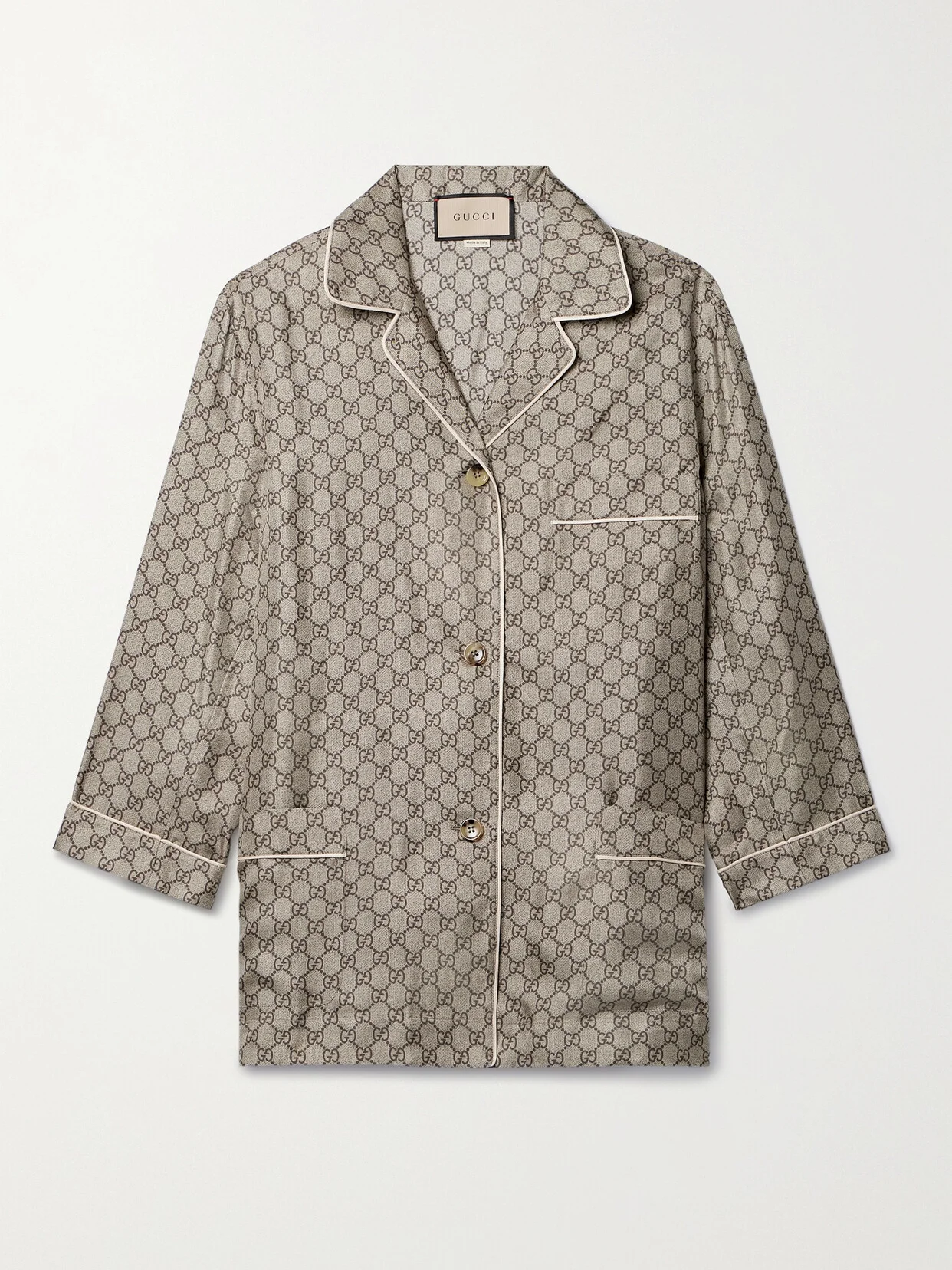 Gucci's shirt is modeled after classic pajama styles - it's complete with piping, notched lapels and a trio of pockets. It's cut from fluid silk-satin and jacquard-woven with the house's 'GG Supreme' motif. Style yours as a set with the coordinating pants.