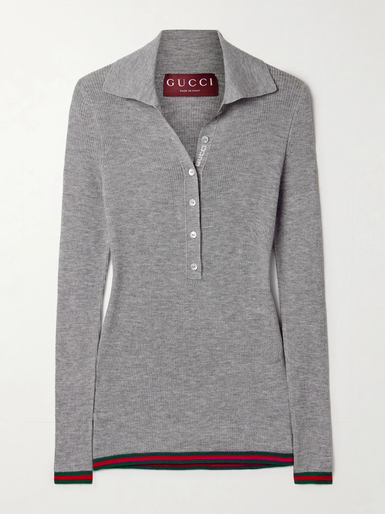 Gucci's take on the classic polo shirt features the label's moniker knitted discreetly along the button-fastening placket, as well as green and red webbing stripes along the cuffs and hem. It's been made in Italy from luxurious cashmere and silk-blend and is ribbed to emphasize the close fit.