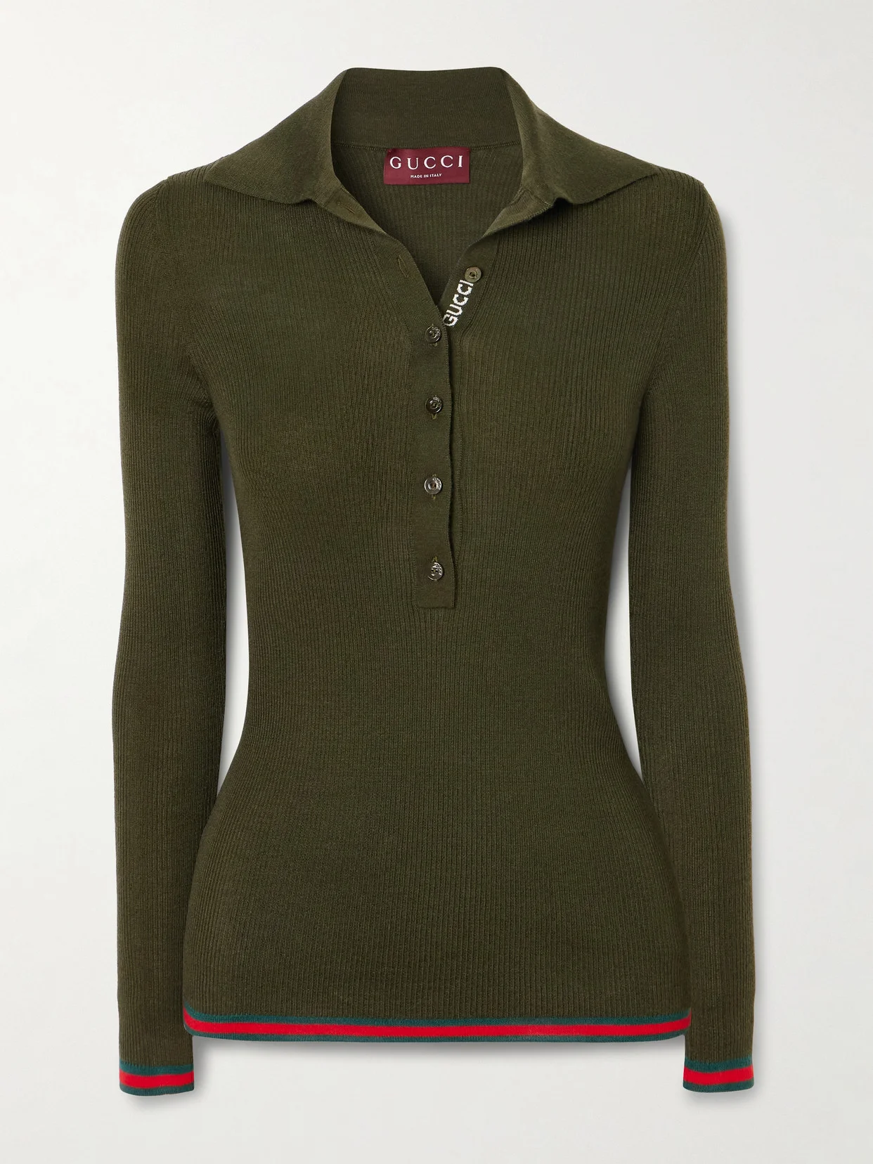 Gucci's take on the classic polo shirt features the label's moniker knitted discreetly along the button-fastening placket, as well as green and red webbing stripes along the cuffs and hem. It's been made in Italy from luxurious cashmere and silk-blend and is ribbed to emphasize the close fit.