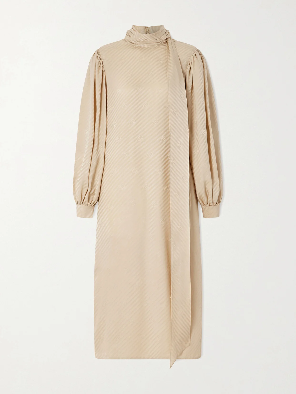 Part of the Cruise '26 capsule, Gucci's dress is a vision for dinners or vacations alike. It's been cut in Italy from silk-jacquard, emblazoned with the recognizable GG monogram, and has a draped, pussy-bow neckline. The gathered blousons sleeves are a thoughtful contrast to the column silhouette.