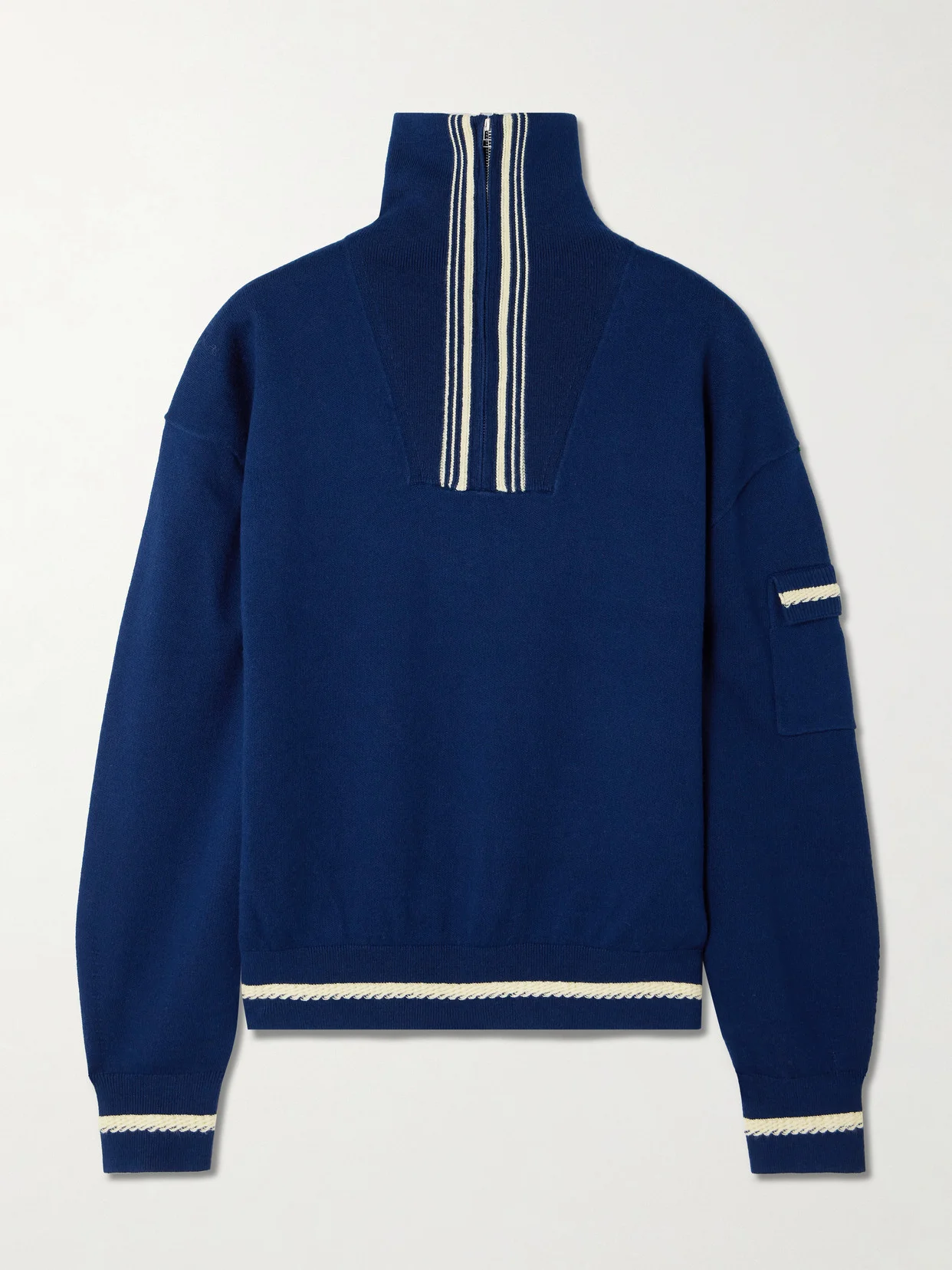 Vintage sportswear inspires the design of Guest in Residence's 'Jib' sweater. Made from a cotton and cashmere-blend, it's traced with contrasting stripes and textured piping. The half-zip, believe it or not, is a trending touch.