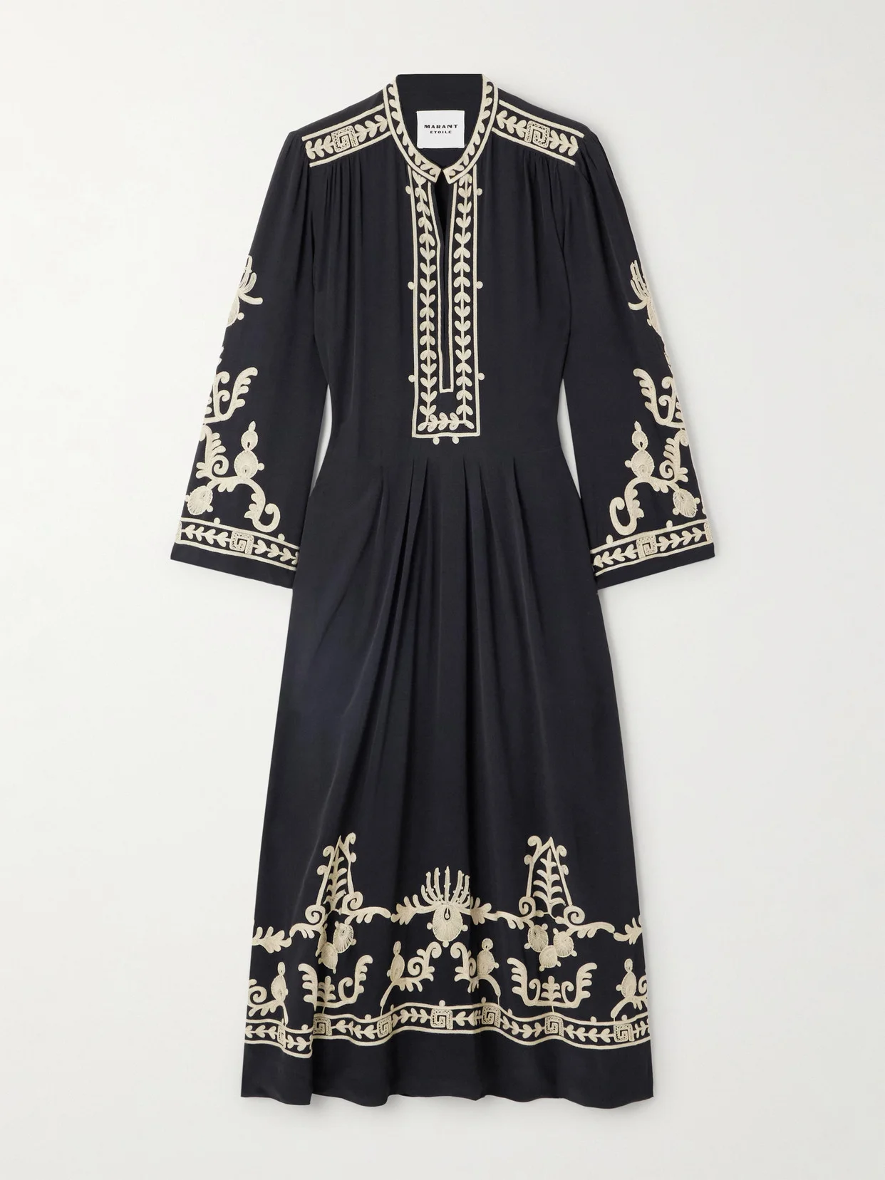 Marant Etoile's dress is beautifully embroidered with decorative edging, highlighting its considered shape. It's cut from crepe with a deep slit neckline and pleating at the waist to create volume though the skirt. We also love that it has pockets at the side.
