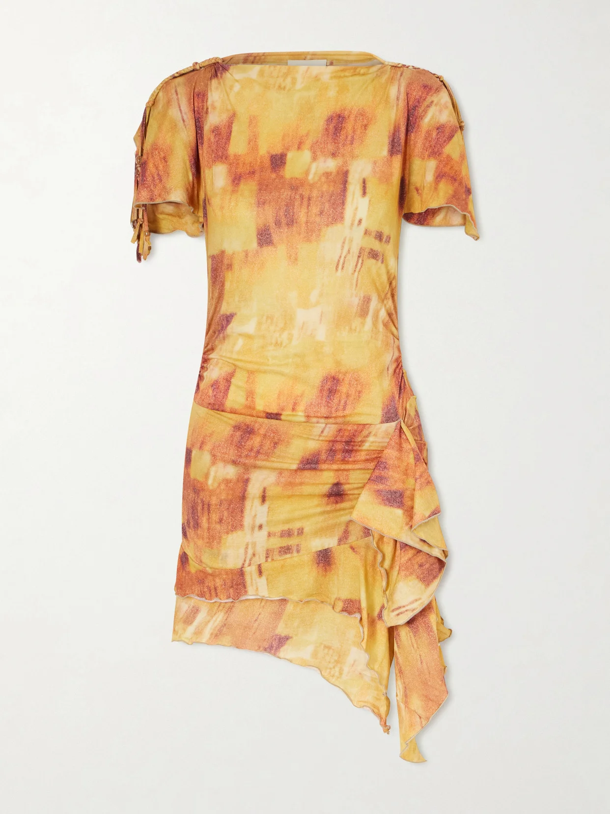 Isabel Marant puts a bohemian twist on classic mini dress silhouettes. Made from cotton-jersey, it has braided detailing along the sleeves, finished with beads and a ruched asymmetric mini skirt. Style it with boots.