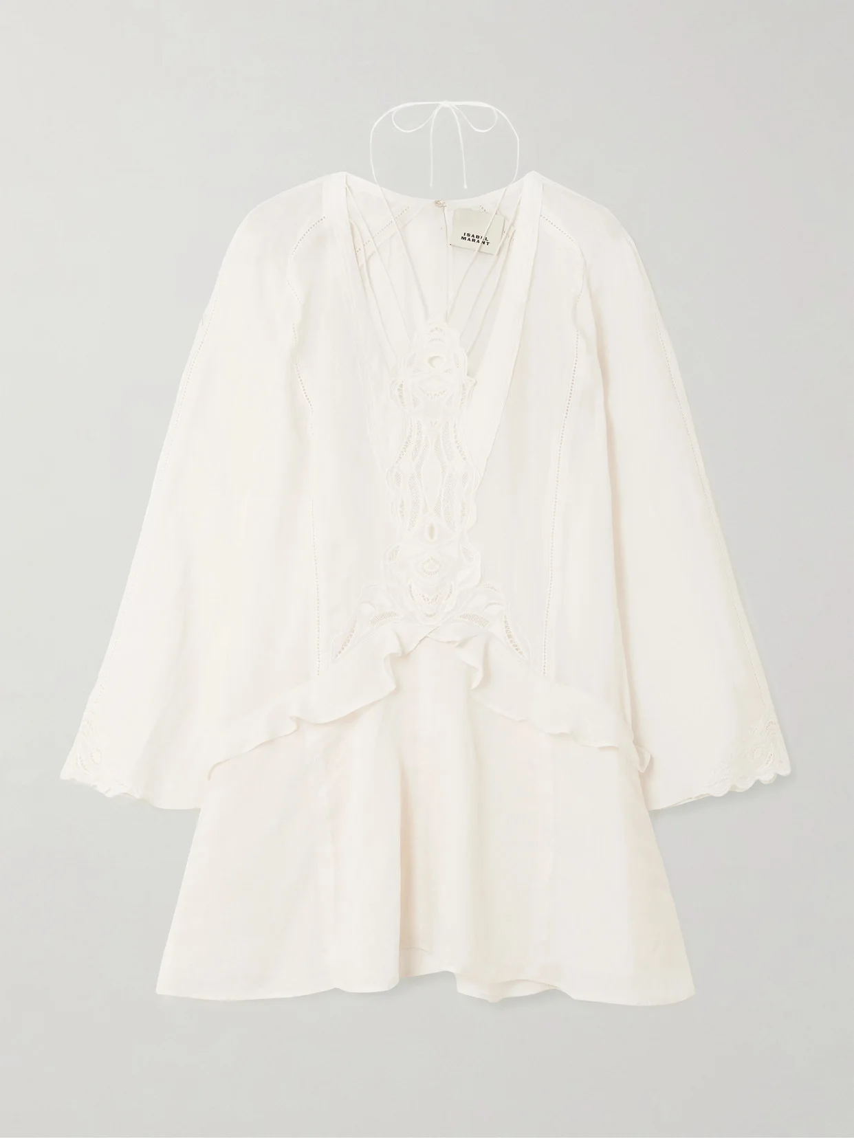 Infused with a bohemian spirit, Isabel Marant's 'Liya' dress is cut from lightweight ramie with wide sleeves and has a ruffled drop waist. The strappy plunging neckline is trimmed with intricate cotton-lace. Slips it on over your bikini for beach walks or barbeques.