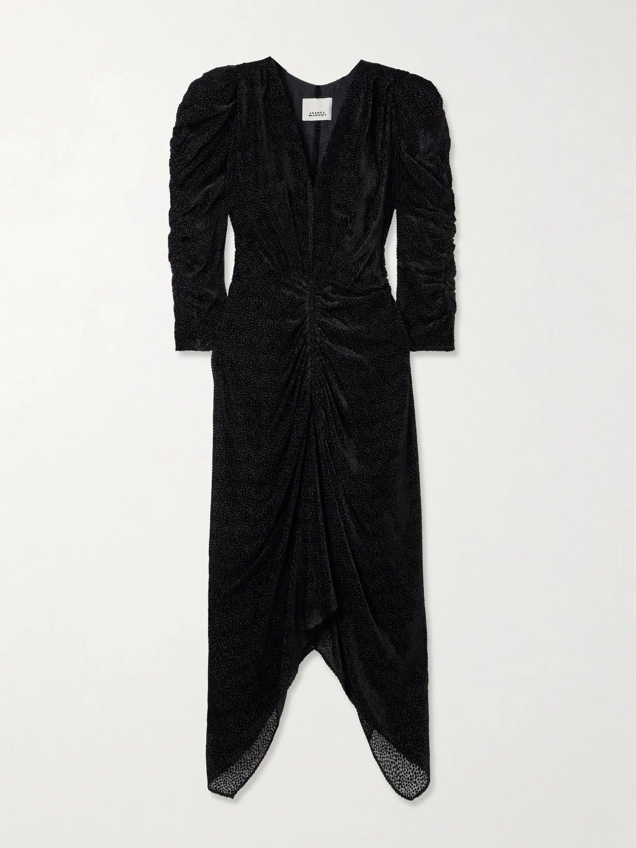 Isabel Marant's 'Nemil' midi dress is made from devore-chiffon silk-blend featuring velvety geometric shapes against a sheer, matte backdrop. It's designed with voluminous sleeves enhanced by puffed shoulders and ruching along the asymmetric skirt to create beautiful texture.