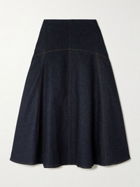 The curved yoke of Jacquemus' skirt feels distinctive to the French label, which favors modern, geometric lines. It's tailored from denim that's blended with a hint of stretch and cashmere, and embroidered with a tiny 'J' at the side. Style yours with knee boots vanishing under the hem. Size & Fit - Fits true to size, take your normal size - Midi-length, designed to be worn just below the natural waist - Mid-weight, slightly stretchy fabric - Model is 177cm/ 5'10" and is wearing a size 26 Model measurements: - Bust: 77cm/ 30.5" - Waist: 62cm/ 24.5" - Hip: 88cm/ 34.5" Details & Care - Dark-blue denim - Concealed zip fastening at side - 93% cotton, 6% cashmere, 1% elastane - Dry clean