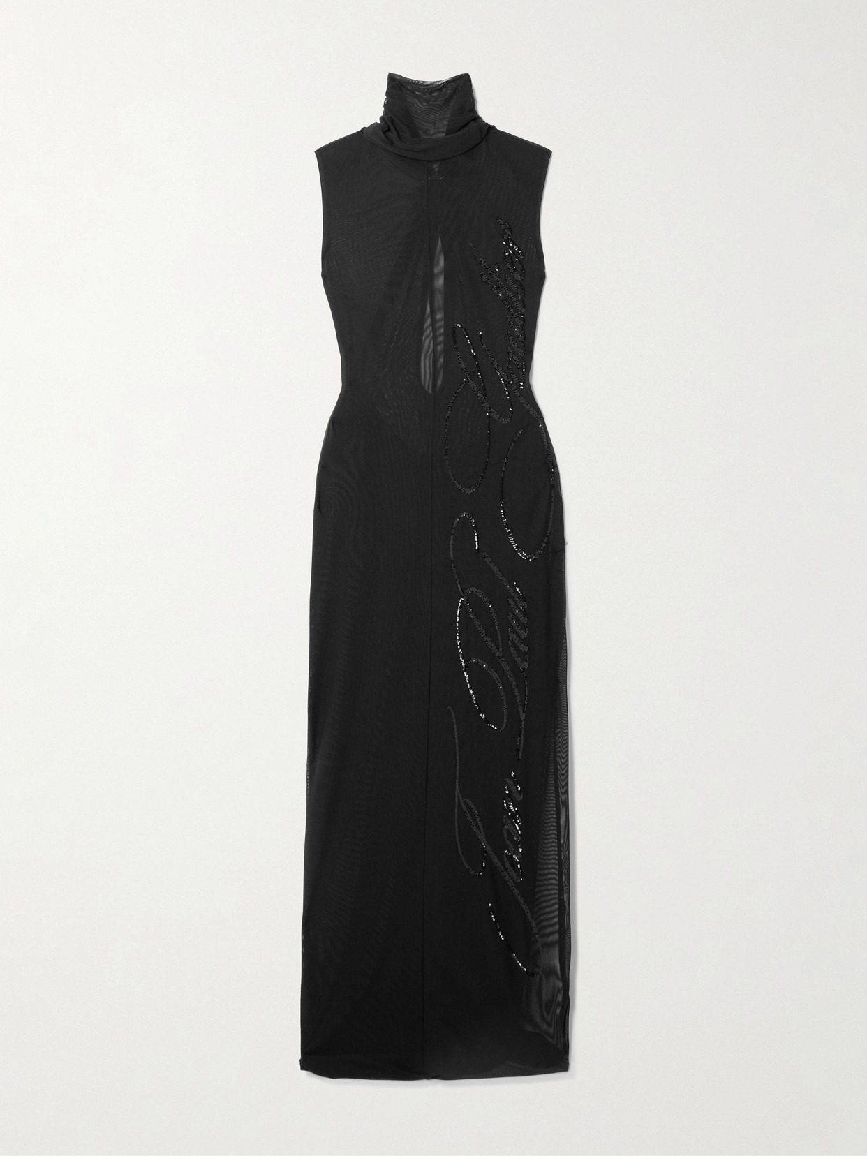Jean Paul Gaultier's name glistens down the front of this dress, sequined in beautiful cursive. It's made from slinky tulle and gathered at the nape of the neck - a piercing-inspired ring holding its shape - so match jewelry to its silver tone.