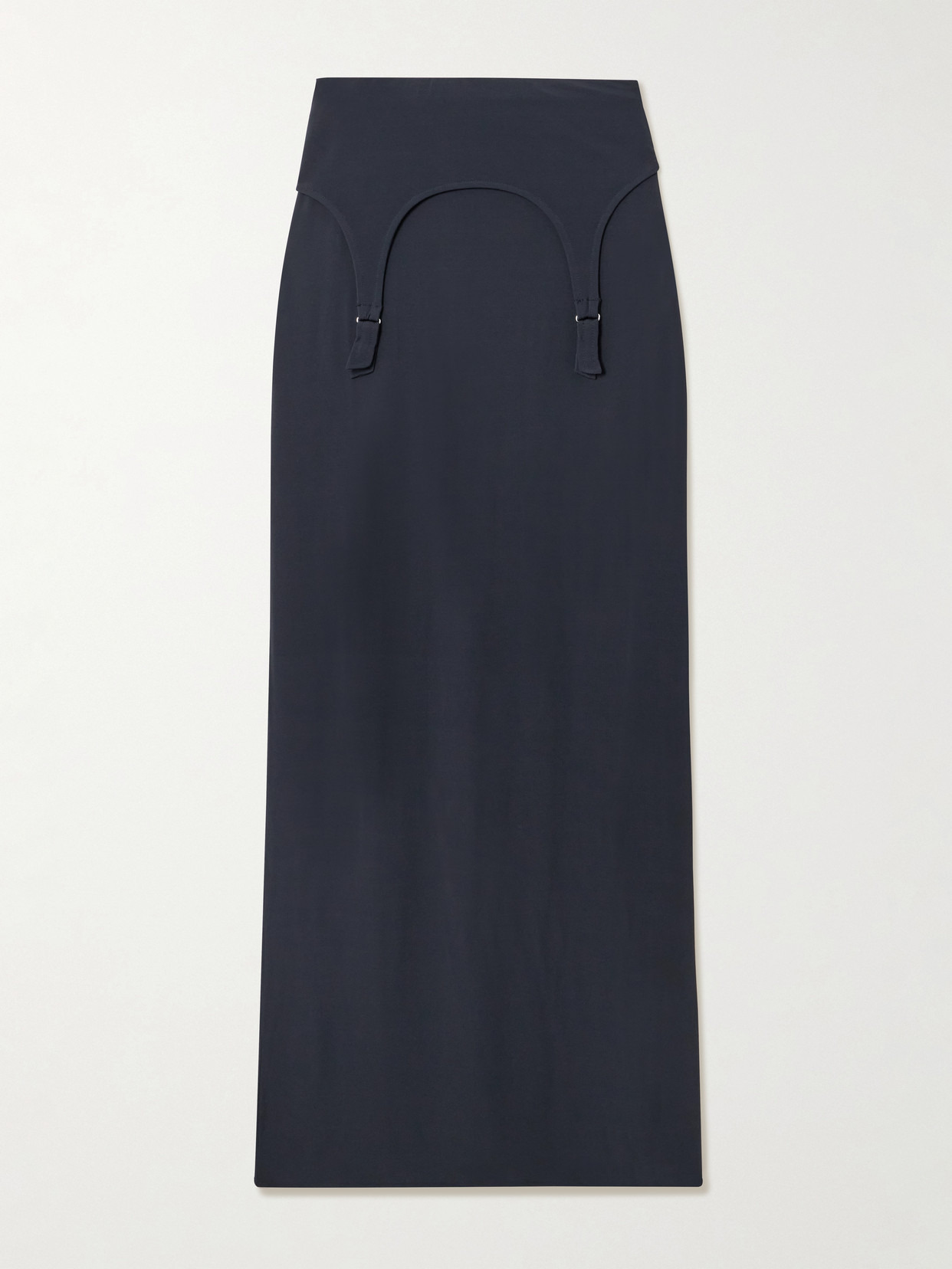 True to Jean Paul Gaultier's subversive spirit, this maxi skirt has a playfully undone feel. It's cut from soft stretch-jersey and detailed with a suspender-strap overlay that toys with the idea of undressing. Style yours with a cropped top or baby tee.
