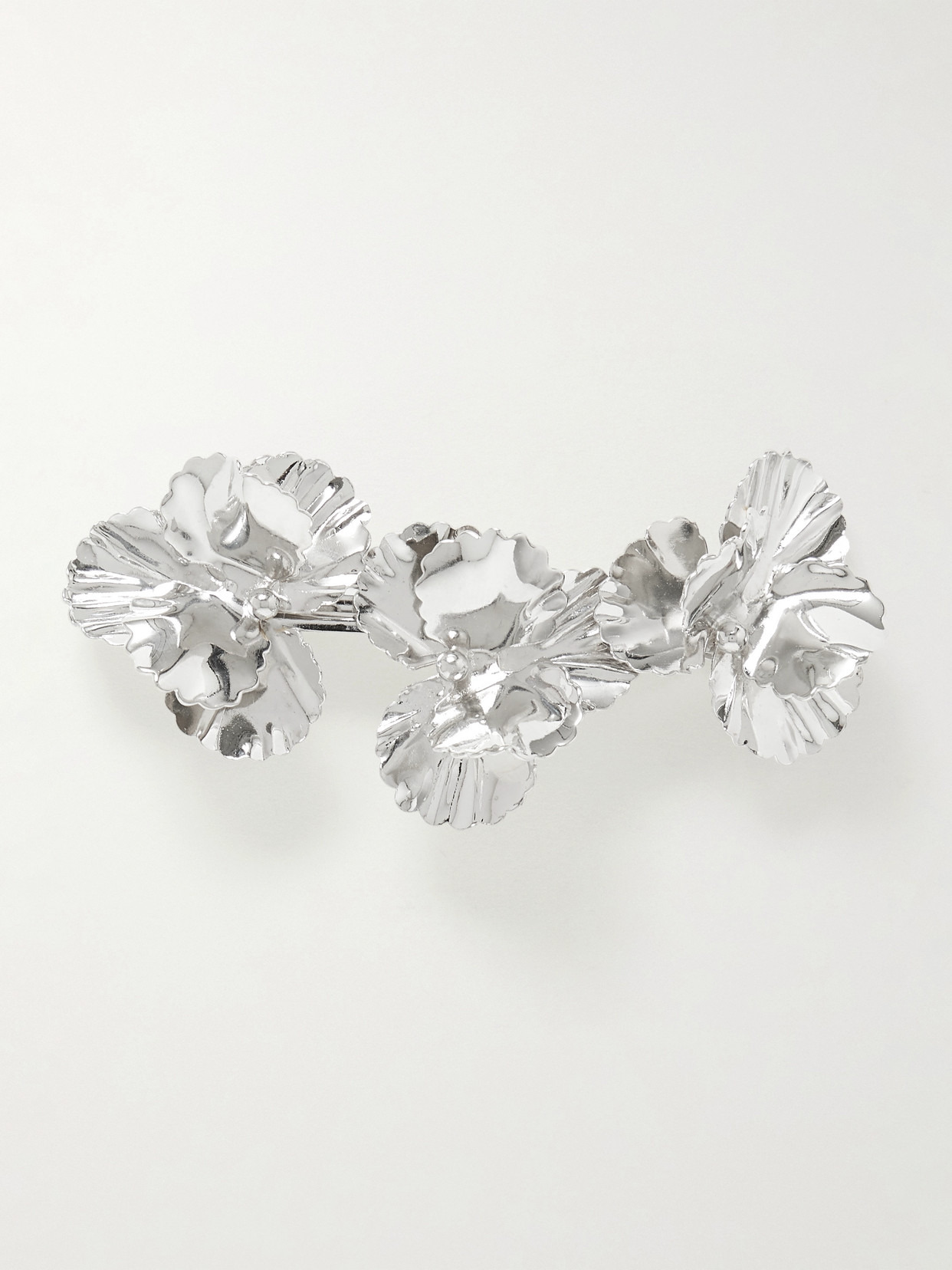 Jennifer Behr's hair clip is sculpted from silver-plated metal to create a trio of delicate pansy flowers. Slip it into any updo for a polished touch.