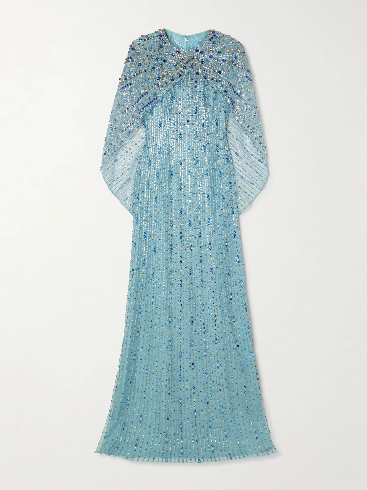 EXCLUSIVE AT NET-A-PORTER. There's no doubt that you'll make an unforgettable entrance at your next event in Jenny Packham's gown. It's made from tulle covered in scores of glistening sequins and crystals and has a cape-effect overlay that flutters as you move. Complement the sky-blue shade with silver jewelry.