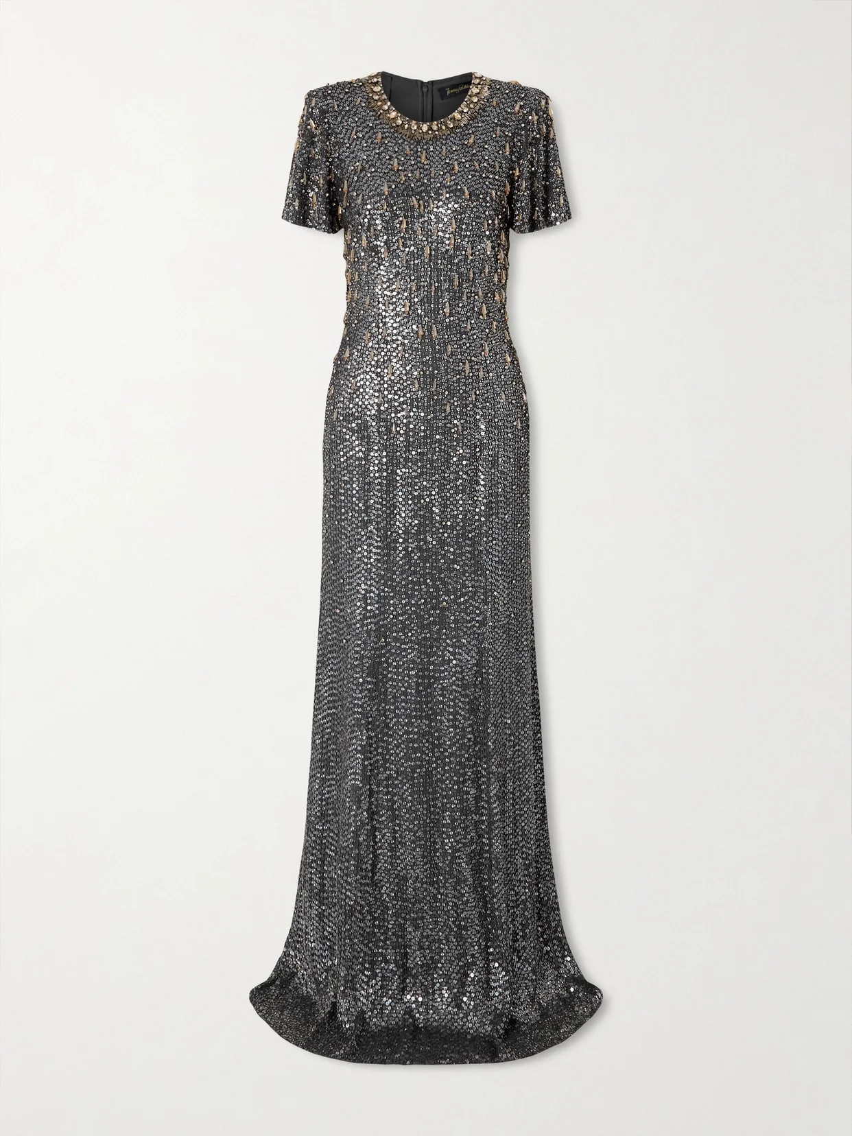 Jenny Packham's 'Serenity' gown is covered with hundreds of glistening sequins and embellished with crystals along the body and neckline, adding extra sparkle. It's handmade from gray crepe and is cut to skim your figure and puddle at the floor.