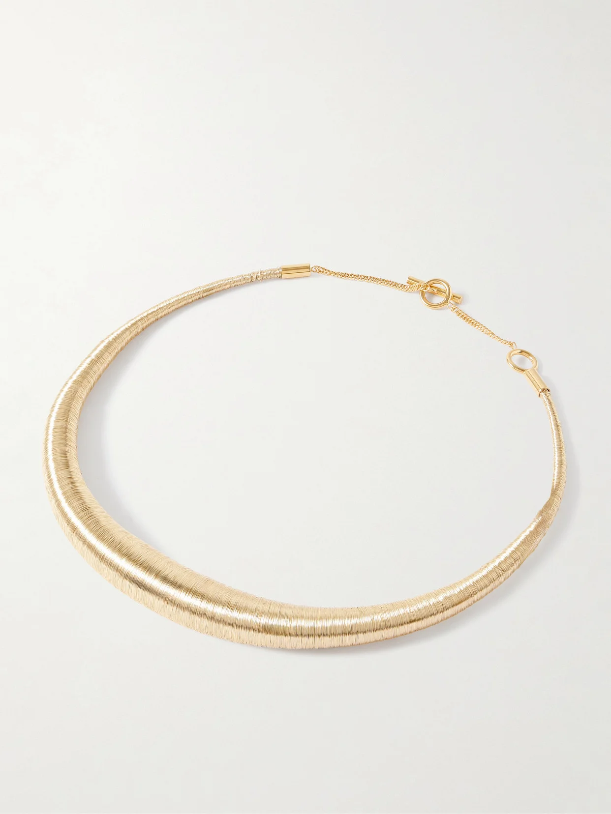 Jil Sander's necklace is crafted from gold-tone wire, meticulously wrapped to form a sculptural silhouette that gradually widens toward the center. The adjustable T-bar fastening allows you to switch up the length depending on your neckline. Our edit includes a silver-tone version, too.