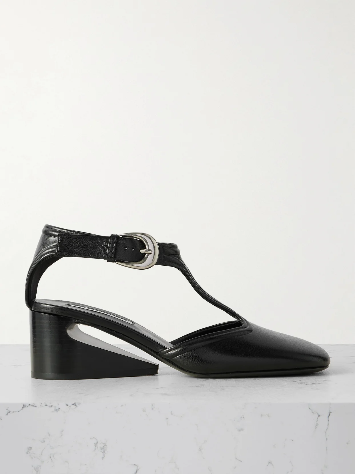 Jil Sander's pumps bring a modern, sculptural element to retro Mary Janes. They've been made in Italy from soft leather with squared toes and T-bar straps. Wear yours with cropped hems so the architectural heels are always on display.