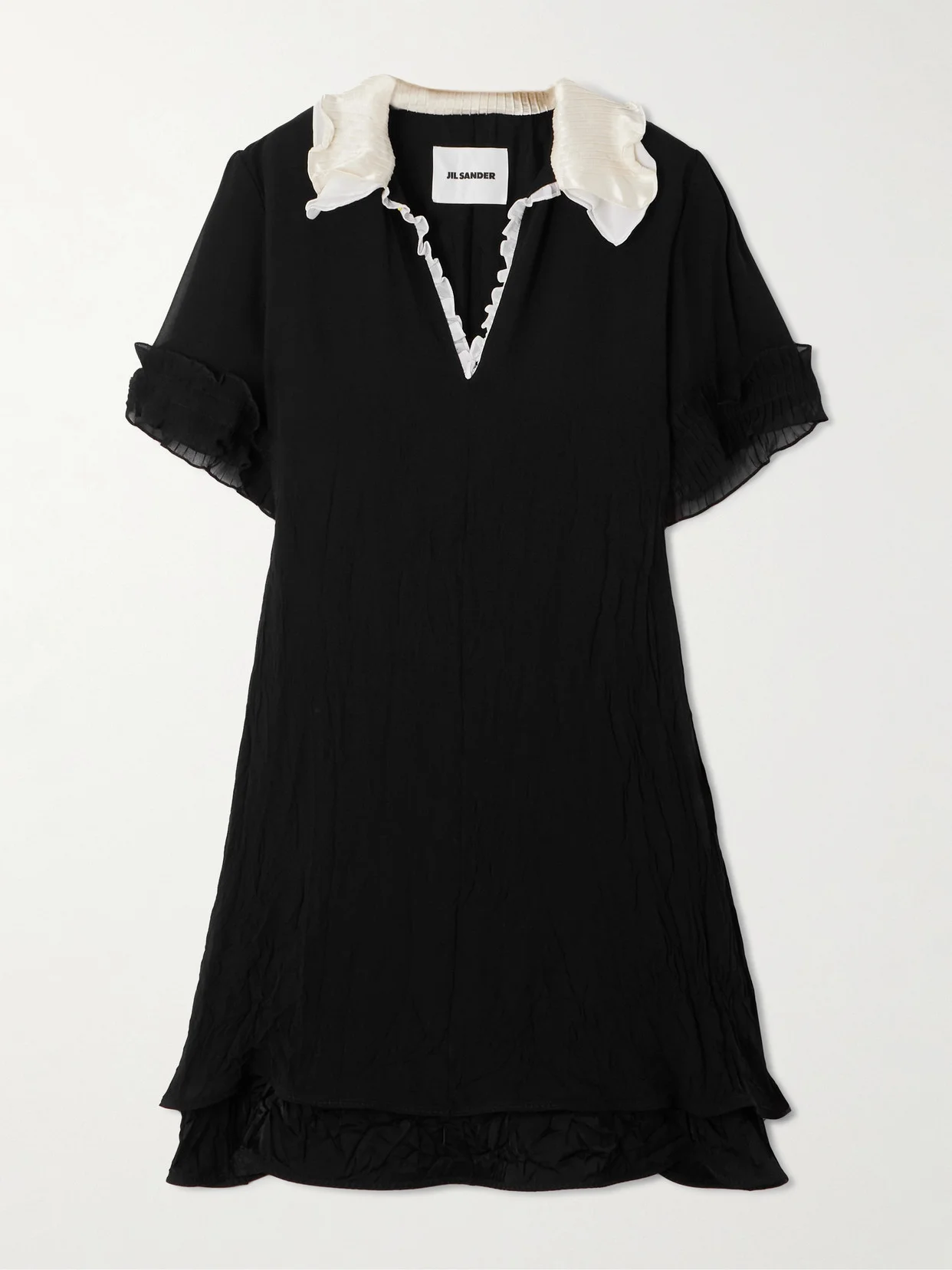 Debuted at the Spring '25 show, Jil Sander's knee-length dress echoes the collection's modern take on 1940s dressing. It's cut from fluid silk-chiffon and detailed with a pintucked satin collar and pretty ruffles. Style yours with Mary Janes or knee boots, as per the runway.