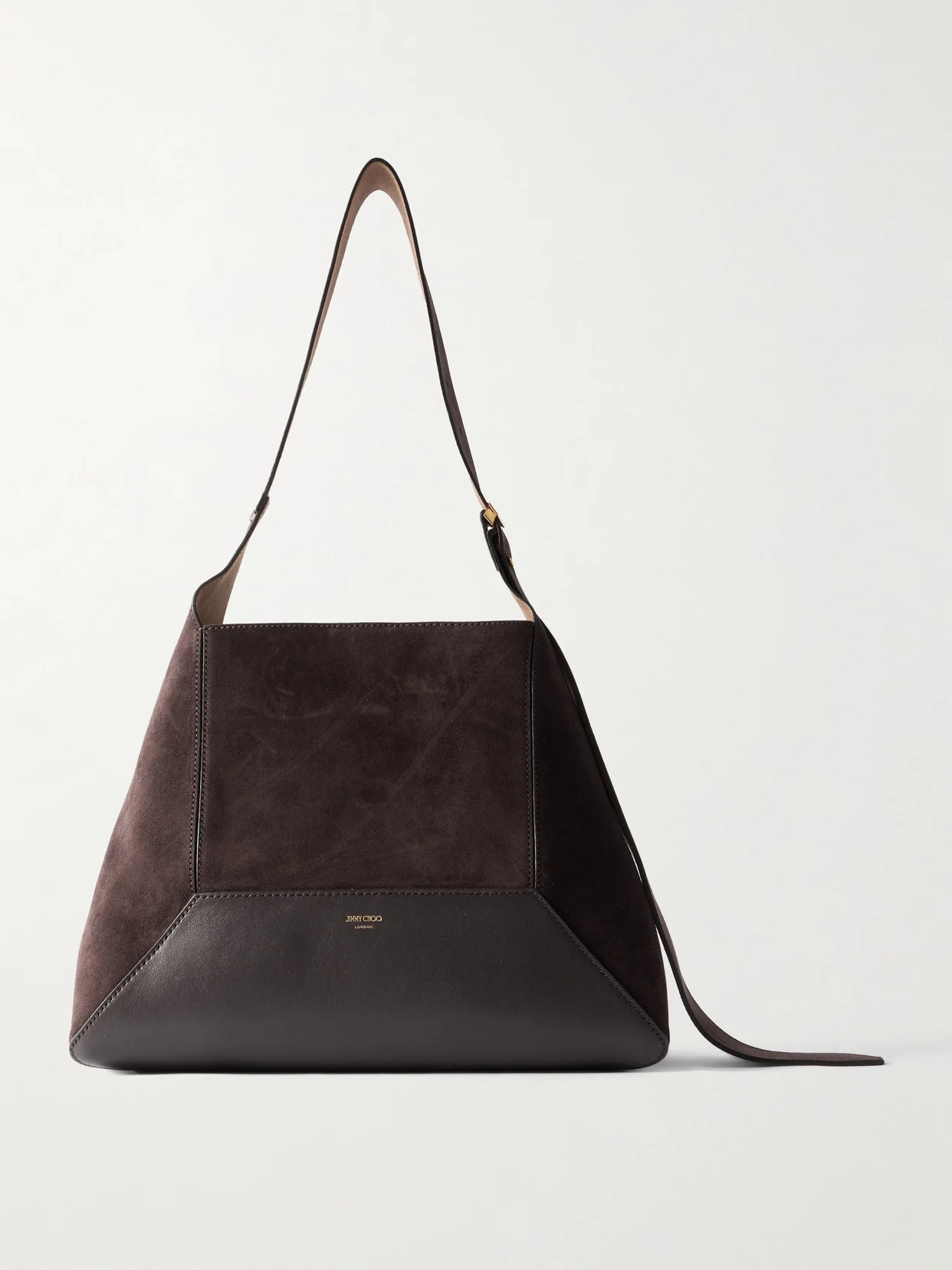 The faceted panels of Jimmy Choo's bag are inspired by diamonds. It's been made in Italy from suede and smooth leather and is sized to hold a book, wallet and small cosmetics pouch.