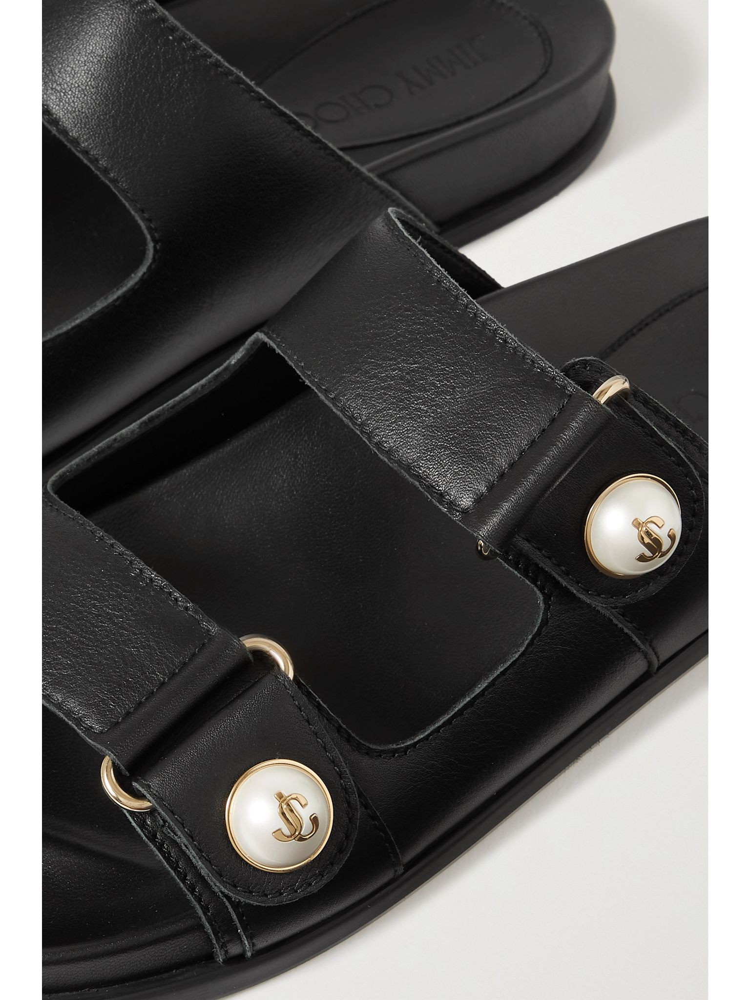 Jimmy Choo's 'Fayence' slides are the type that you can slip on with any summer outfit. They're made from buttery leather with adjustable straps and contoured footbeds. Look closely to notice the signature gold logo on the faux pearl embellishments. Size & Fit - Fits true to size, take your normal size - Italian sizing Details & Care - Slight heel - Black leather (Calf) - Slip on