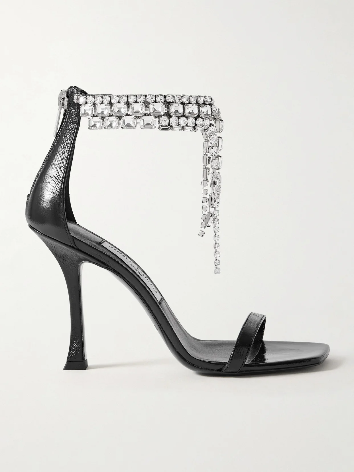 Jimmy Choo's ‘Verity' sandals are dripping with crystals that cascade from the slim ankle strap, adding undeniable glamour. They're made from leather and have square toes and sculptural 100mm heels.