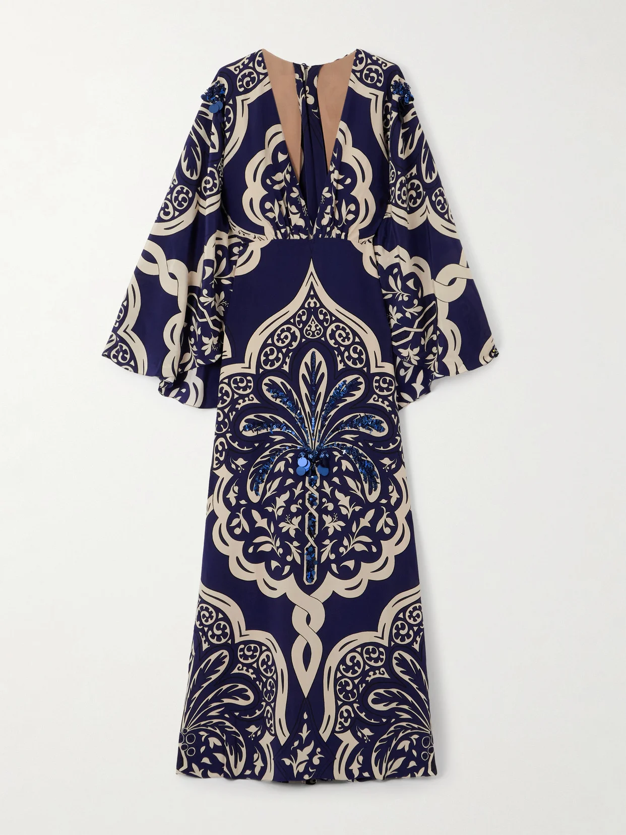 Cape-effect embellished printed silk-crepe maxi dress Navy