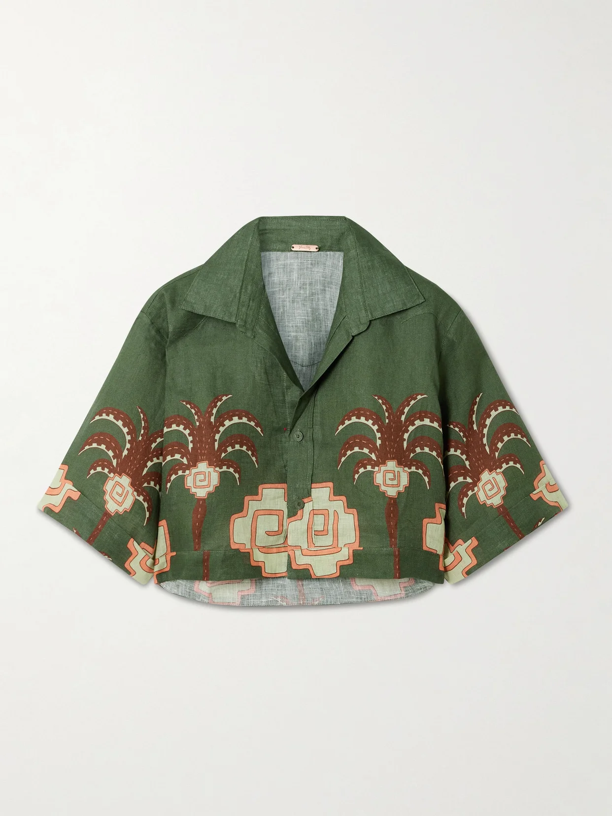 Johanna Ortiz' resortwear is locally made in Cali, Colombia by a team of mostly female craftspeople using traditional techniques. This cropped 'Cumbi' shirt is cut from breathable certified linen for a slightly loose fit and is printed with geometric and palm motifs. Wear yours with shorts or a floaty maxi skirt. Lower-Impact Materials. This product is made using at least 50% lower-impact materials or ingredients. Responsible Craftsmanship. This product promotes artisanal skills and a brand that invests in communities and adheres to fair-trade principles. Find out more about our NET SUSTAIN criteria here.