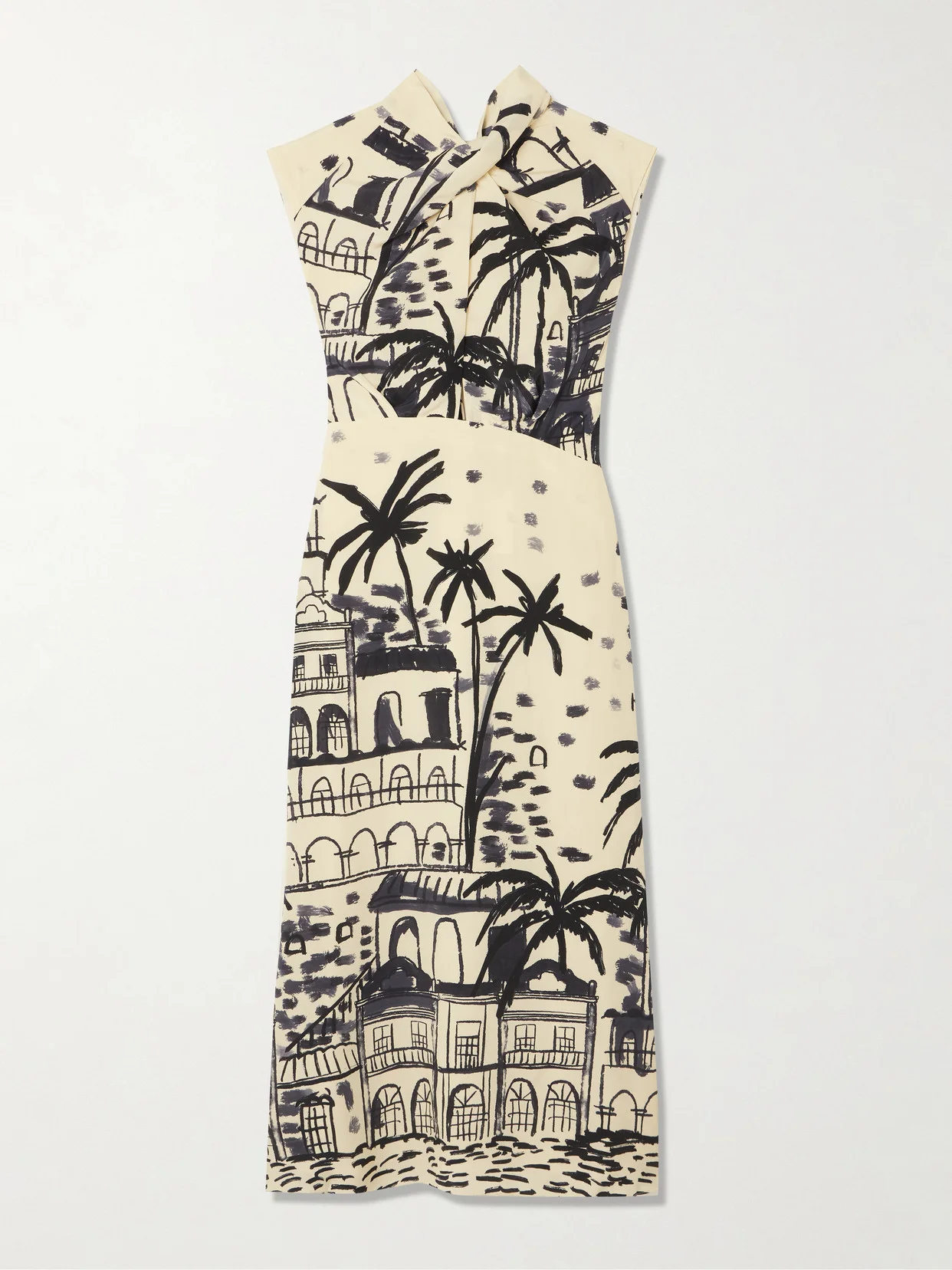 Johanna Ortiz's 'Interdimensional' midi dress is cut from silk and printed with the brand's seasonal motif, featuring artful palm trees and Spanish-style buildings. It has a twisted collar and a keyhole neckline, revealing just a sliver of skin.