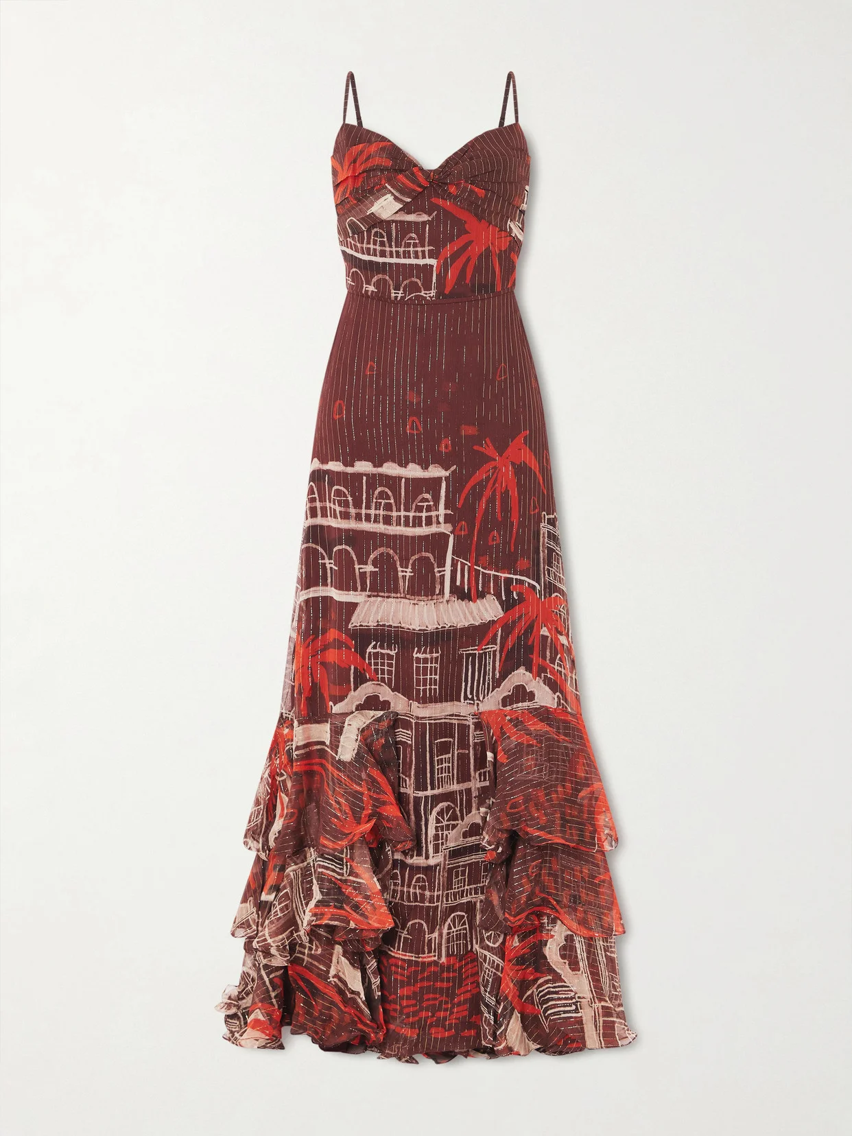 Johanna Ortiz's 'Pasos Nocturnos' dress is printed with palm trees and houses inspired by the brand's Colombian roots. It's made from silk-chiffon flecked with metallic threads and features a twisted bust and cascading ruffle tiers along the maxi skirt.