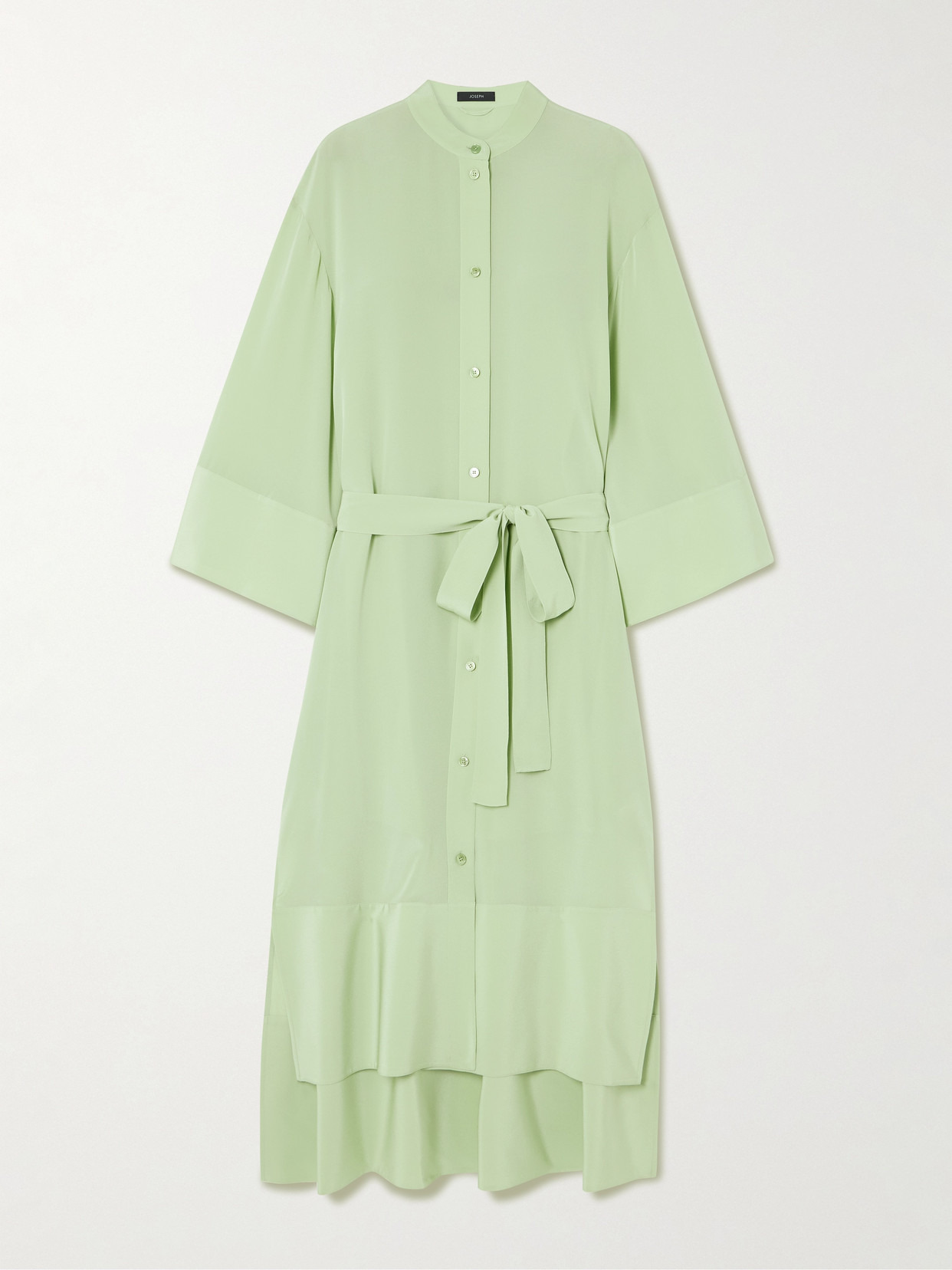Joseph's 'Darious' dress is cut from fluid silk-crepe in a loose shape defined by back pleats. The wide sleeves perfectly balance the stepped hem, while the self-tie belt can be used to cinch the waist.
