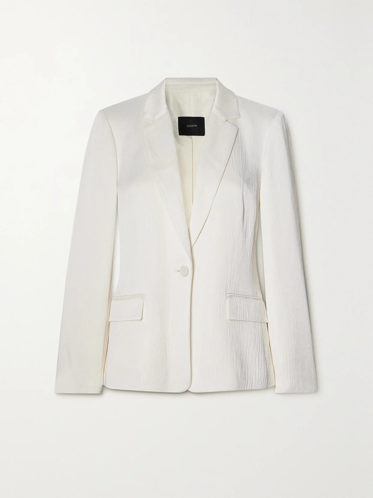 Joseph's 'Joaquim' blazer is cut from crinkled-satin with a slight sheen - the timeless ivory makes it an elegant bridal option that's wearable long after you've uttered your vow. Framed by lightly padded shoulders, it has slim notch lapels and fastens with a single covered button.
