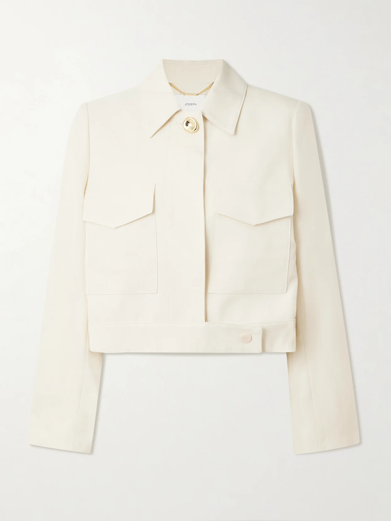 Joseph's 'Renoir' jacket channels boiler-suit influences through its peaked flap pockets, offset by a refined pebbled gold button. It's tailored from a soft woven fabric which drapes effortlessly.