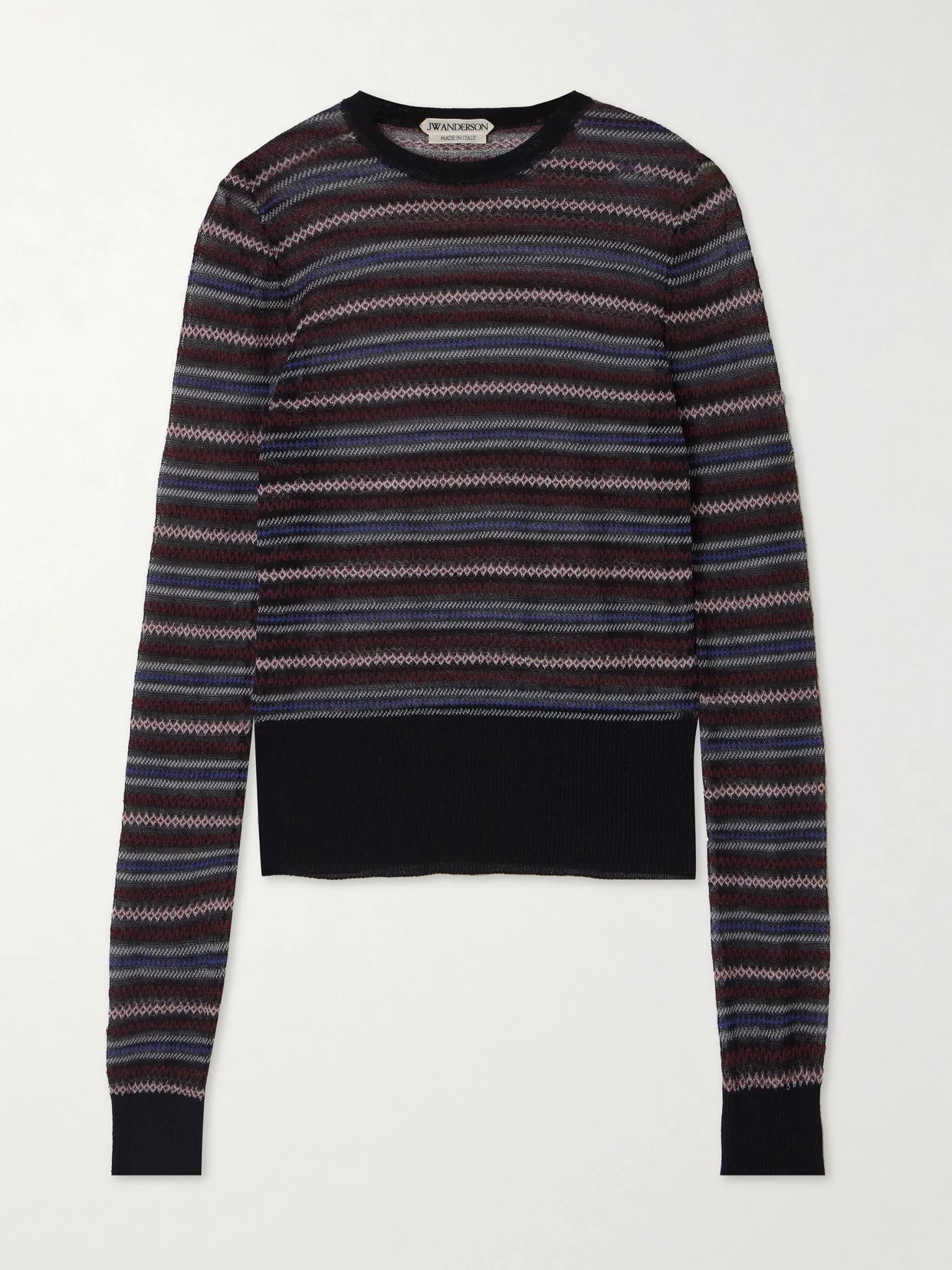 JW Anderson's sweater is intarsia-knitted from soft cotton-blend to resemble a Fair Isle pattern, using a slightly open stitch for a semi-sheer finish. The ribbing at the hem is longer than most, which helps define the shape.