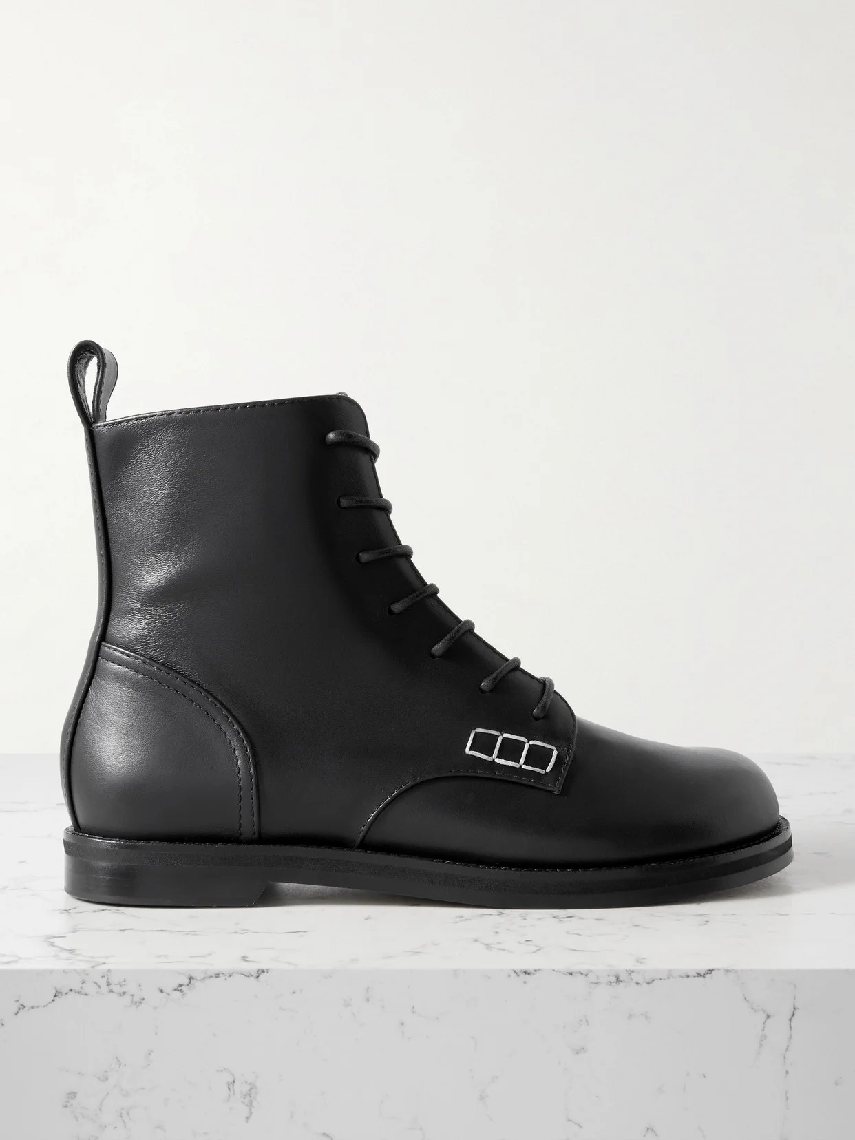 Known for hybrid designs, JW Anderson brings loafer detailing to these boots - note the contrast stitching on the sides. They've been made in Italy from smooth leather and have a classic combat style.