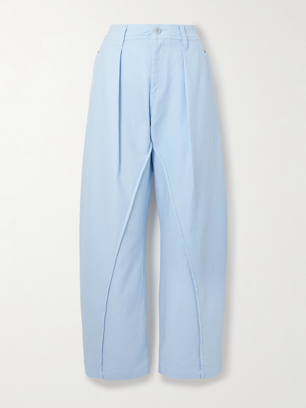 JW Anderson's pants have exaggerated twisted seams that accentuate the barrel-leg shape. They're made from light-blue twill and pressed with pleats at the waist.