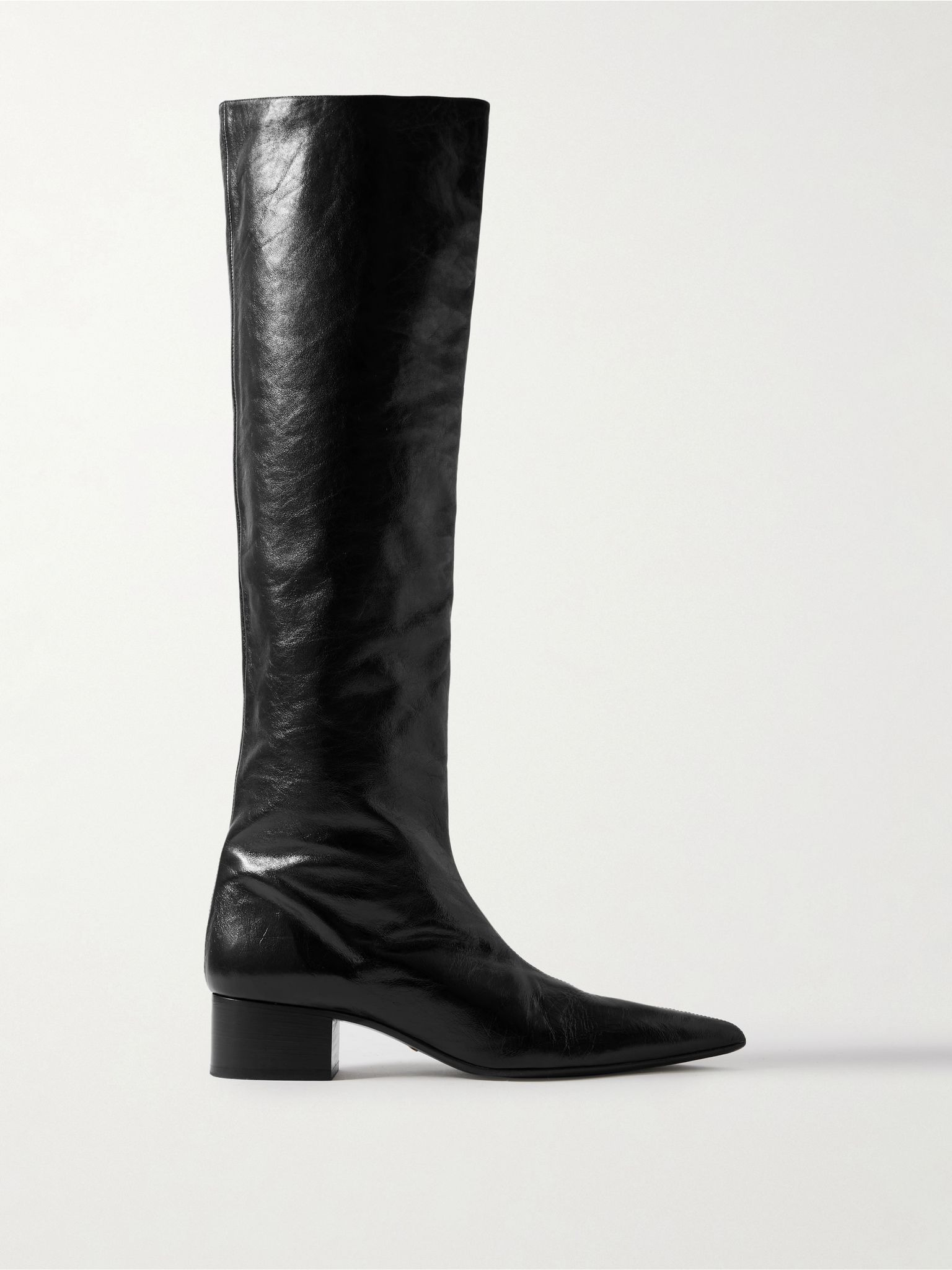 KHAITE's 'Andee' knee boots will be your go-to style in cooler weather. Crafted in Italy from crinkled-leather, they have sharply pointed toes and rest on low block heels that offer a comfortable amount of lift. Show yours off with mini and midi hemlines. Details & Care - Heel measures approximately 40mm/ 1.5 inches - Black crinkled-leather (Calf) - Pull on