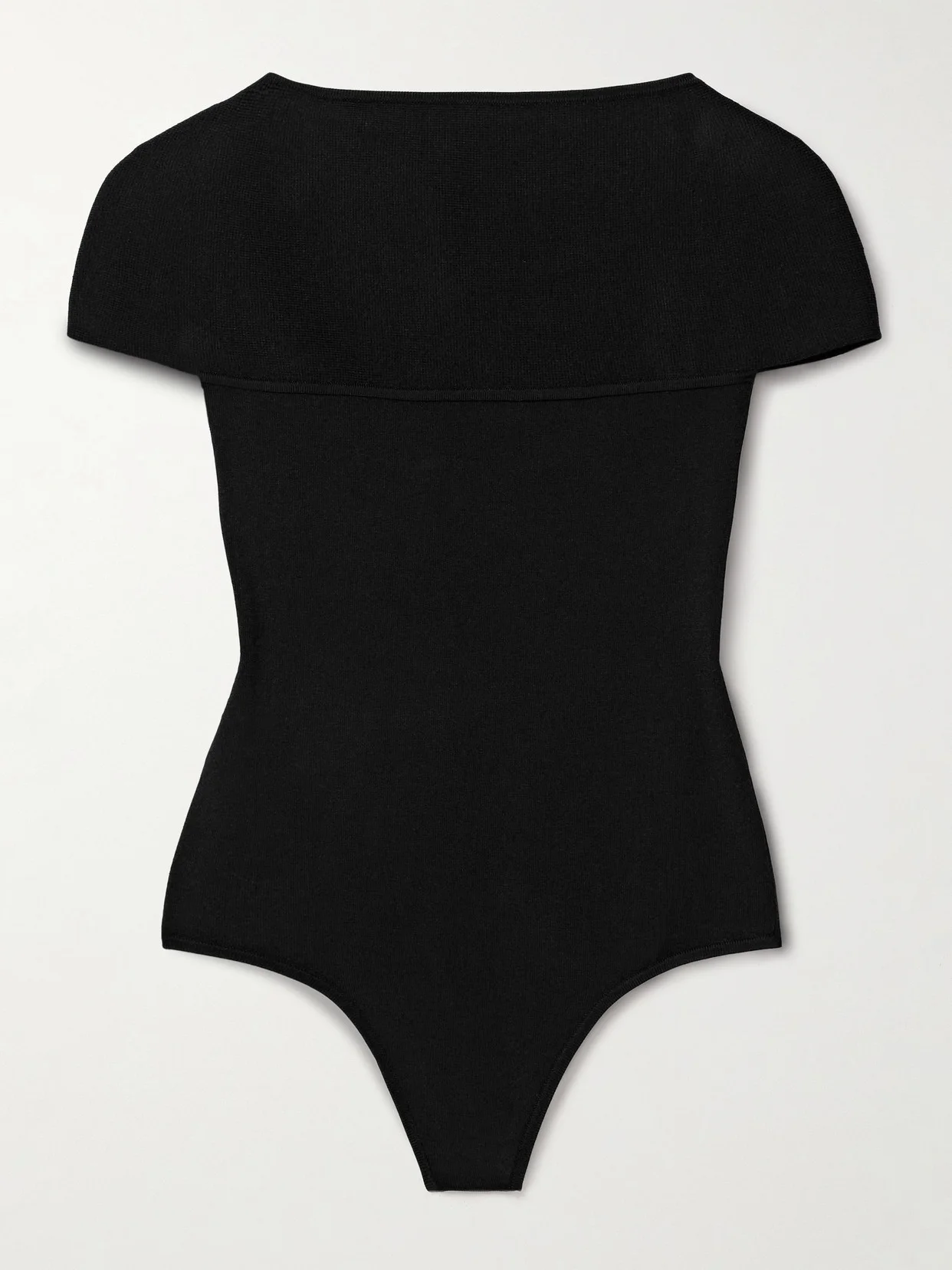 KHAITE's 'Basile' bodysuit has a seamed boat neckline that looks like it's folded and sits just off the shoulder at first glance. It's knitted for a close fit with cap sleeves and reveals a touch of skin at the back.