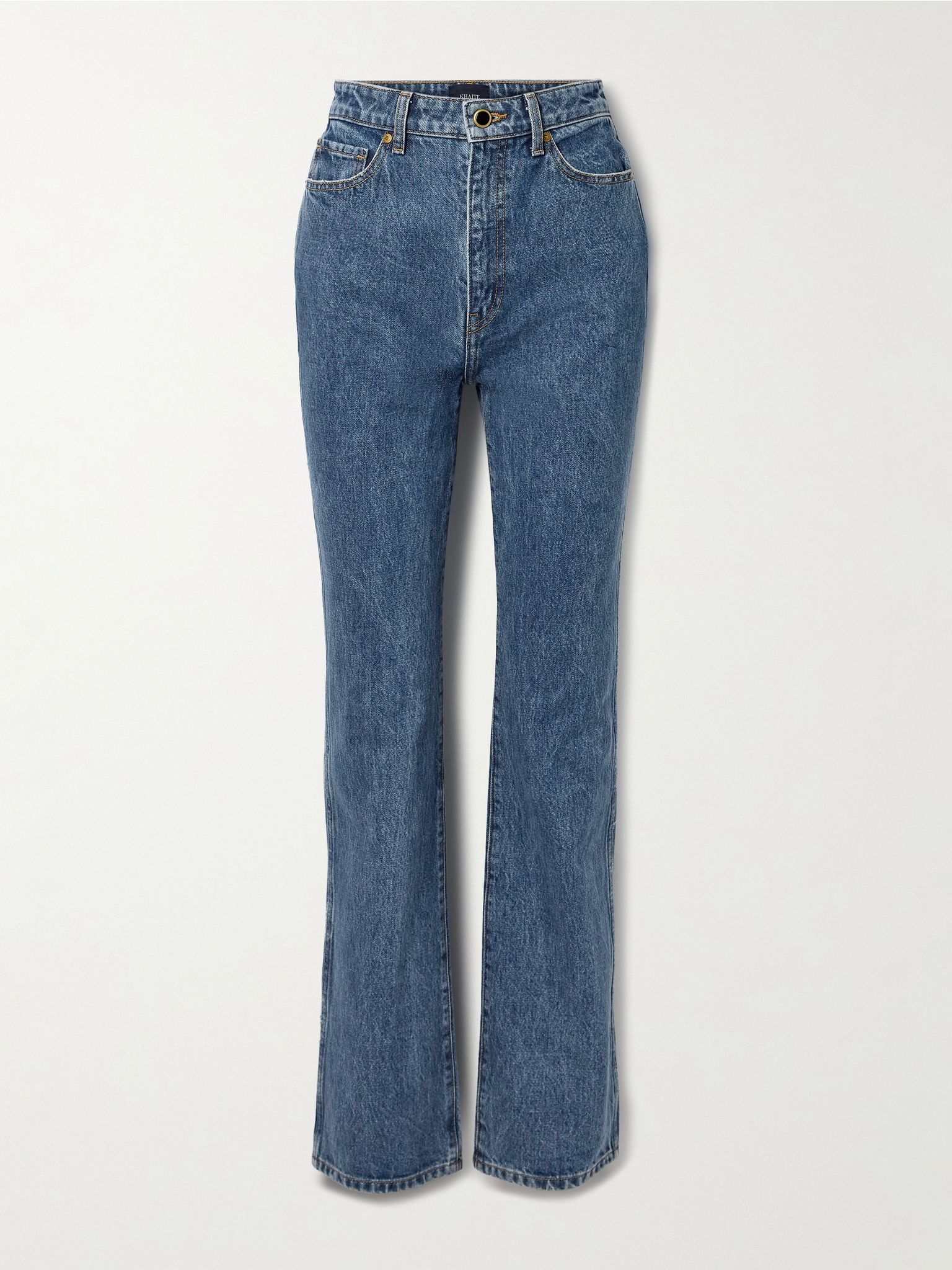 KHAITE's effortless approach is consistent with every design, including the label's denim. These 'Danielle' jeans have a high-rise waistband that makes the slim legs look even sleeker. Each pair is faded and whiskered by hand to look perfectly worn. Size & Fit - Fits true to size, take your normal size - High-rise, cut for a slim fit - Mid-weight, non-stretchy denim - Model is 180cm/ 5’11” and is wearing a size 26 Details & Care - Blue denim - Button and concealed zip fastening at front - 98% cotton, 2% polyurethane - Designer wash: Boone