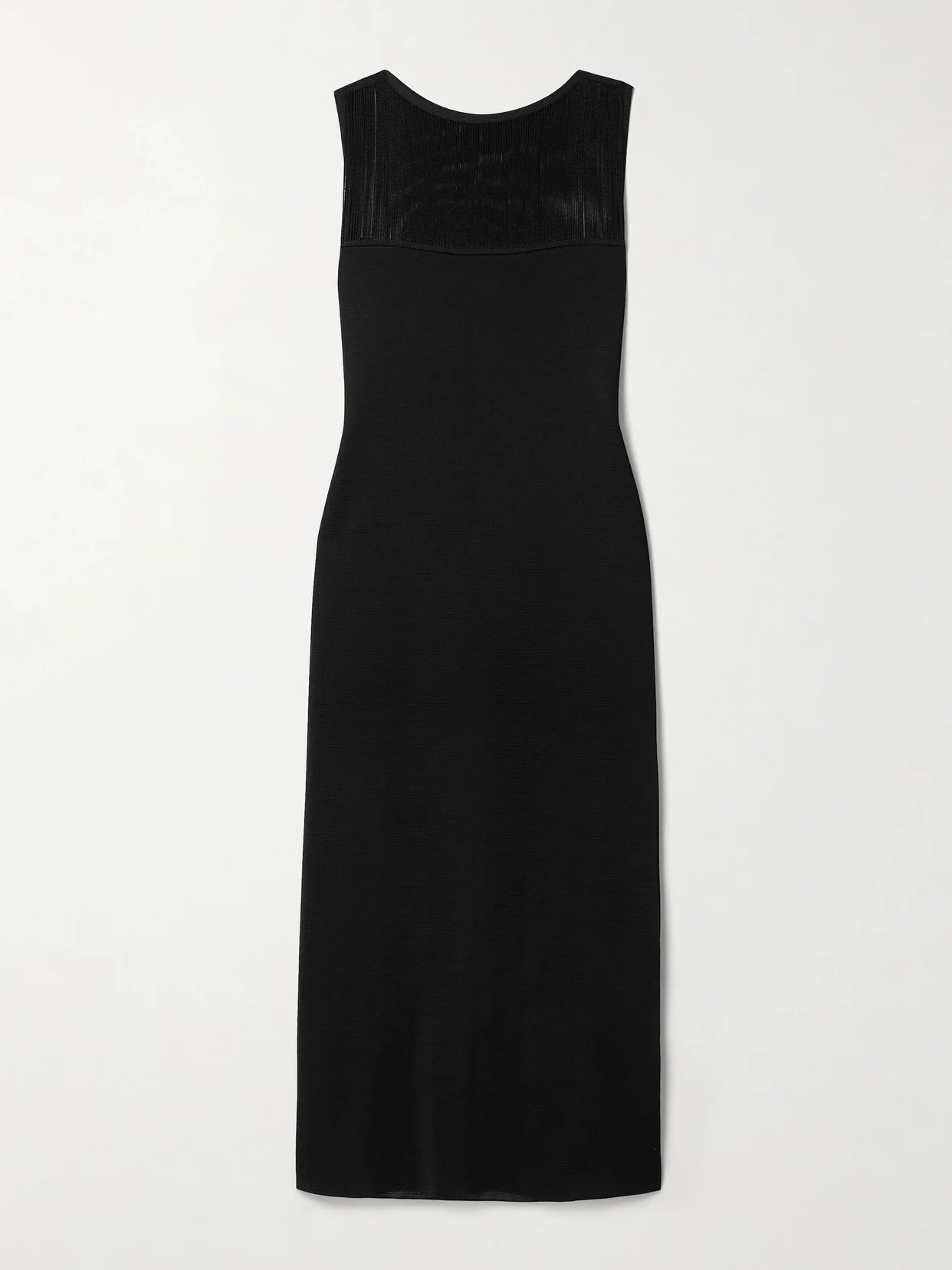 KHAITE's Spring '25 collection is described by the brand as "at once robust and delicate, veiled and exposed." Part of the range - and capturing all of the above - this 'Ruslan' dress has a fringed neckline that shows a hint of decolletage and beautifully contrasts the close-fitting, knitted bodice. Add the brand's red 'Cage' sandals for a gorgeous pop of color.