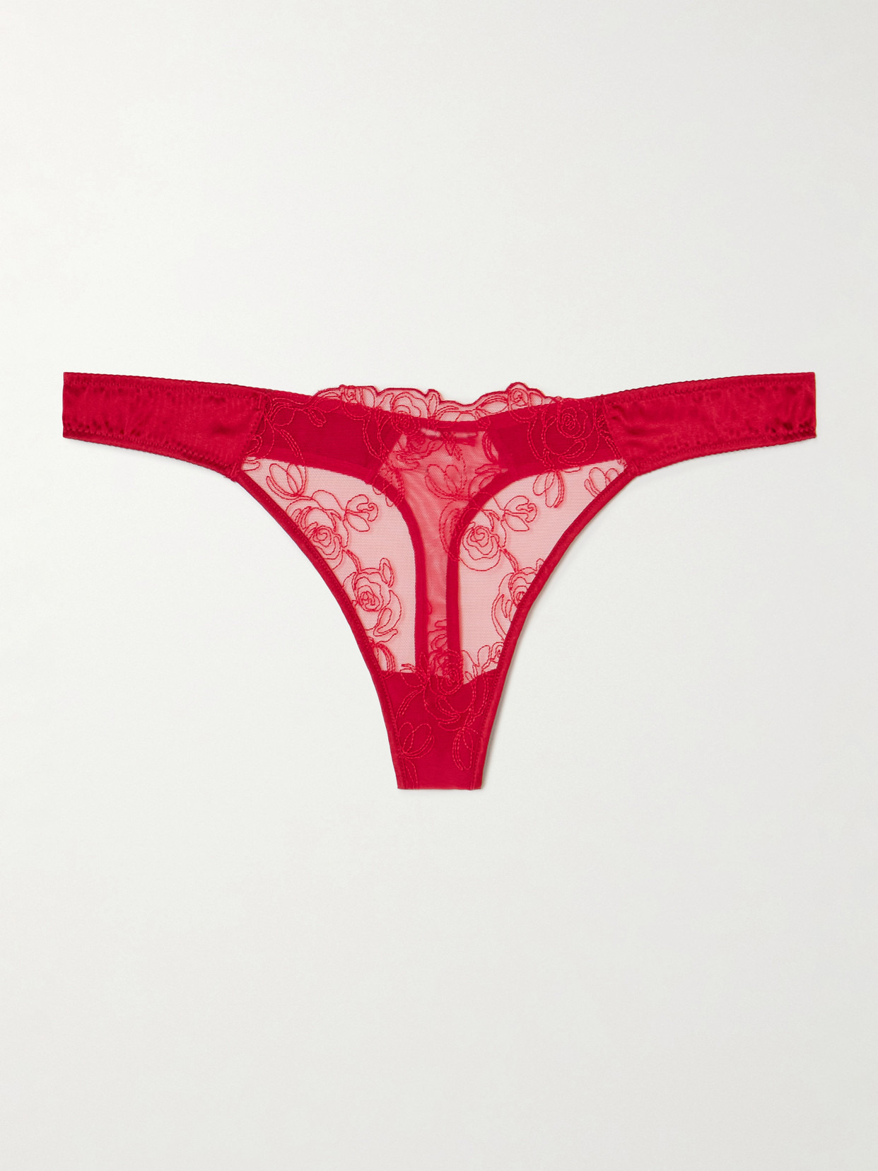 Kiki de Montparnasse's thong is embroidered with roses and has a delicate scalloped edge. It's made from tulle and stretch-silk charmeuse in a sultry red shade. Wear yours with the matching bra.