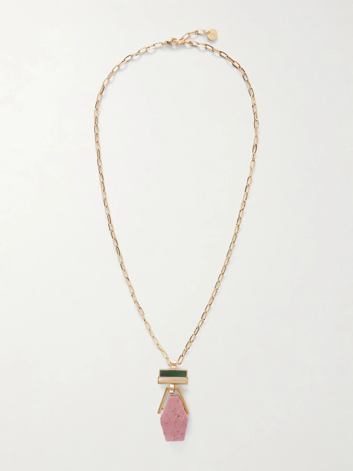 Cast in Italy from gold-plated metal, La DoubleJ's 'Bridge Portal' necklace is centered with zoisite and thulite, cut in captivating geometric shapes. The brand chose the latter stone as it is believed to deepen meaningful connections with others. Layer it outside necklines so it can be properly admired.