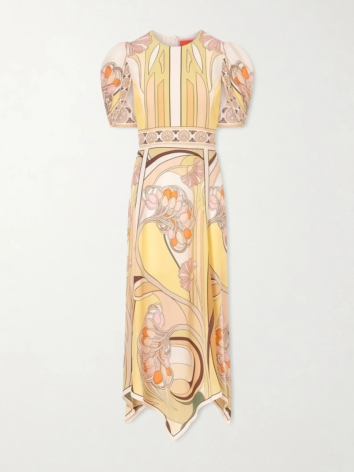 La DoubleJ's ‘Cherie' dress reimagines classic silhouettes with a playful, whimsical print. Crafted from lustrous silk crepe de chine, it showcases one of the brand's signature geometric floral patterns. The fitted bodice is paired with gathered, balloon-style short sleeves, flowing into a skirt with side splits and jagged hems.