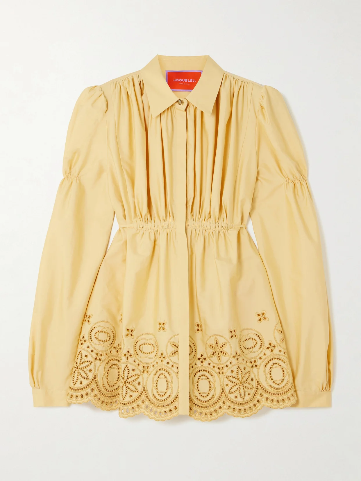 You'll feel pretty and polished in La DoubleJ's 'Franca' shirt - with a touch of whimsy thanks to those princess-esque sleeves. Tailored from cotton-blend sateen with broderie anglaise cutouts along the hem, there are so many charming details to call out, from the gathered bodice to the slim ties at the back and scarab-engraved buttons.