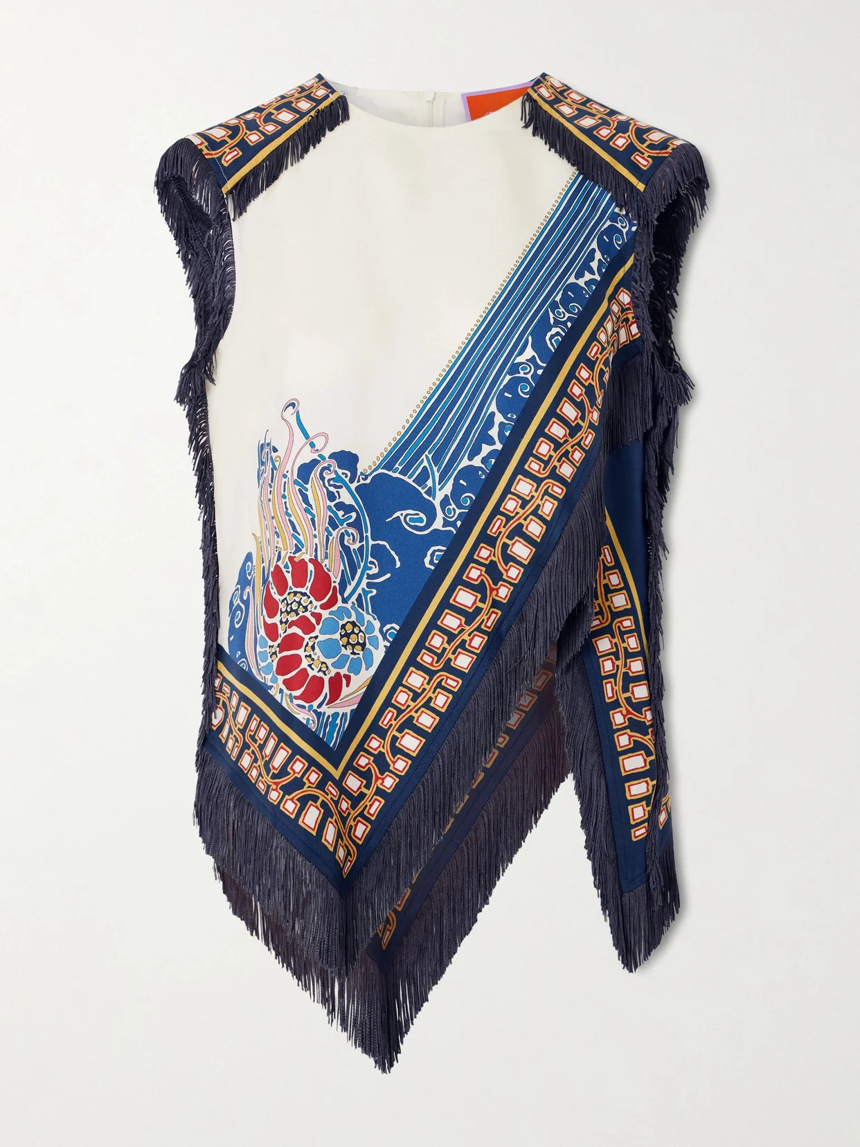 Fringed Asymmetric Printed Silk-twill Top