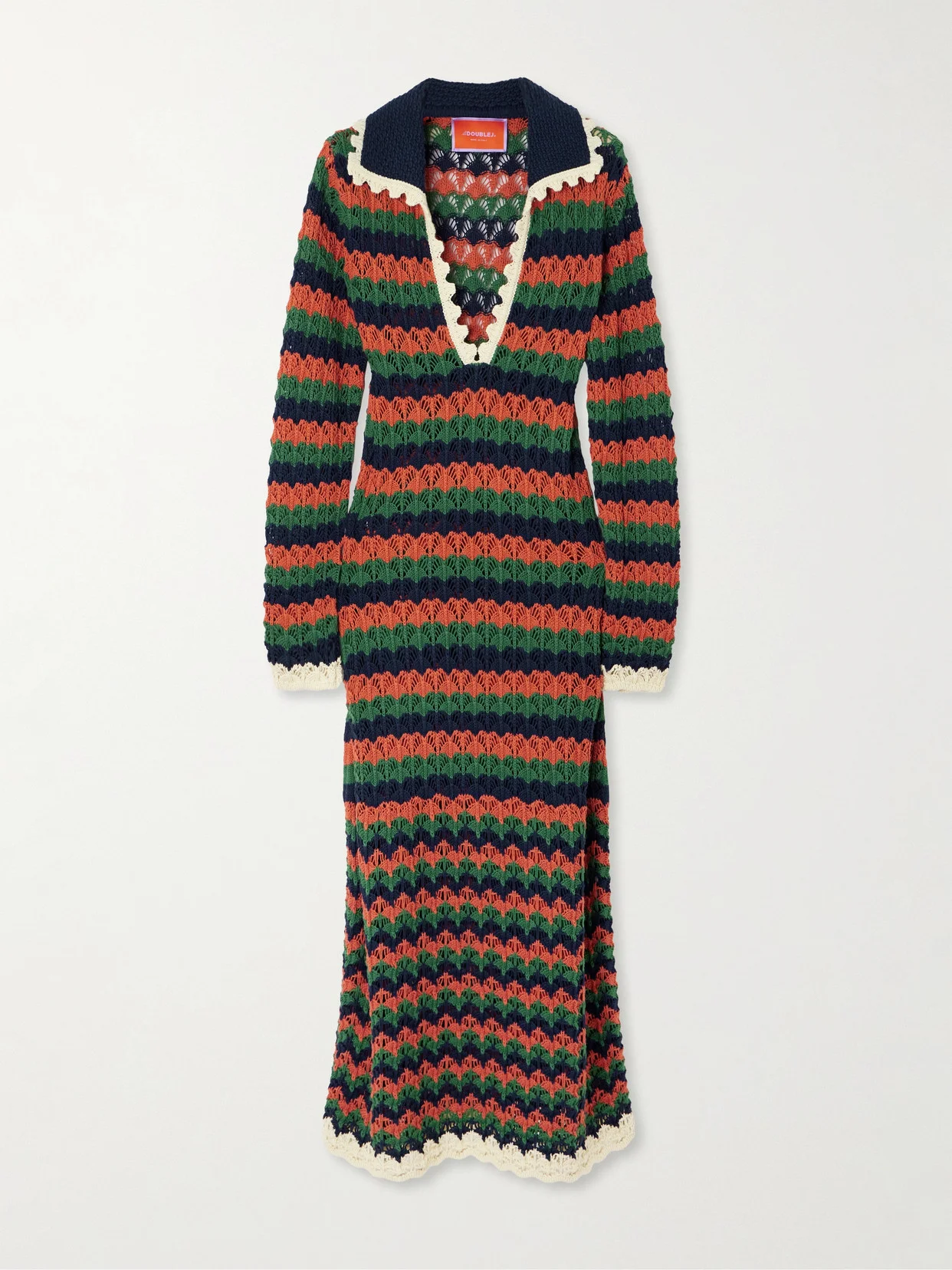 La DoubleJ's 'Perry' dress is intricately knitted from cotton in vibrant stripes - the brand is renowned for its eye-catching patterns. Designed for a figure-skimming fit, it has an airy, open construction. The deep collared neckline is outlined in contrasting scalloped trims.