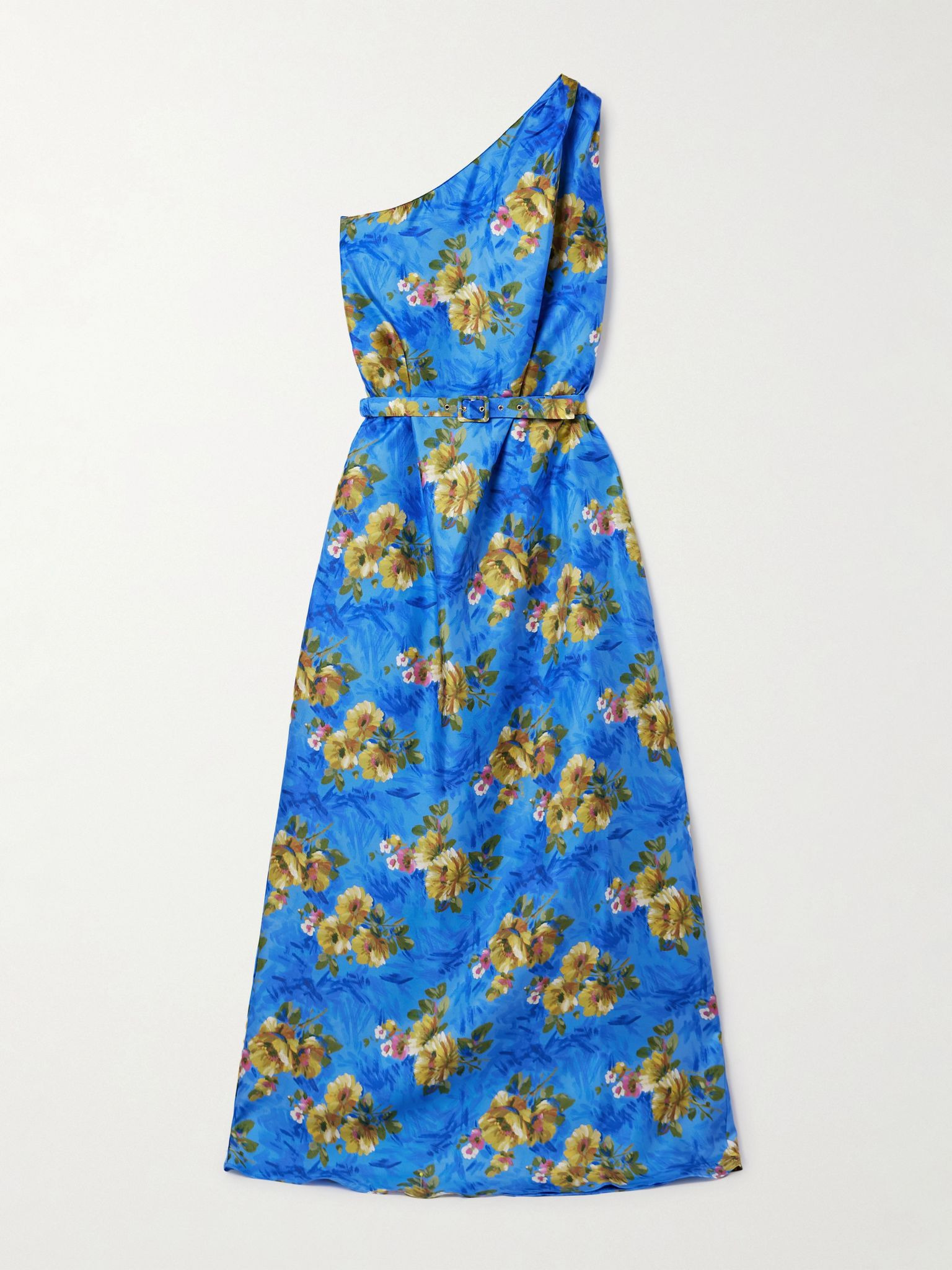 Roy one-shoulder belted floral-print silk-twill maxi dress Blue